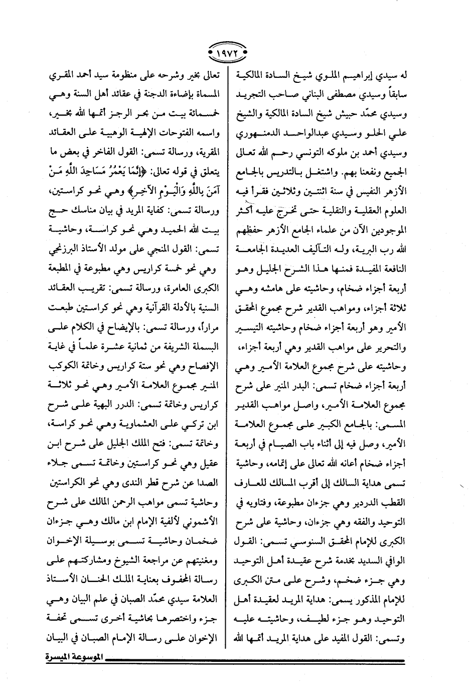 له سيدي إبراهيم الملوي شيخ السادة المالكية سابقًا وسيدي مصطفى البناني صاحب التجريد وسيدي محمد حبيش شيخ السادة المالكية والشيخ علي الحلو وسيدي عبد الواحد الدمنهوري وسيدي أحمد بن ملوكه التونسي رحم الله تعالى الجميع ونفعنا بهم. واشتغل بالتدريس بالجامع الأزهر النفيس في سنة اثنتين وثلاثين فقرأ فيه العلوم العقلية والنقلية حتى تخرج عليه أكثر الموجودين الآن من علماء الجامع الأزهر حفطهم الله رب البرية، وله التآليف العديدة الجامعة النافعة المفيدة فمنها هذا الشرح الجليل وهو أربعة أجزاء ضخام، وحاشيته على هامشه وهي ثلاثة أجزاء، ومواهب القدير شرح مجموع المحقق الأمير وهو أربعة أجزاء ضخام وحاشيته التيسير والتحرير على مواهب القدير وهي أربعة أجزاء، وحاشيته على شرح مجموع العلامة الأمير وهي أربعة أجزاء ضخام تسمى: البدر المنير على شرح مجموع العلامة الأمير، واصل مواهب القدير المسمى: بالجامع الكبير على مجموع العلامة الأمير، وصل فيه إلى أثناء باب الصيام في أربعة أجزاء ضخام أعانه الله تعالى على إتمامه، وحاشية تسمى هداية السالك إلى أقرب المسالك للعارف القطب الدردير وهي جزءان مطبوعة، وفتاويه في التوحيد والفقه وهي جزءان، وحاشية على شرح الكبرى للإمام المحقق السنوسي تسمى: القول الوافي السديد بخدمة شرح عقيدة أهل التوحيد وهي جزء ضخم، وشرح على متن الكبرى للإمام المذكور يسمى: هداية المريد لعقيدة أهل التوحيد وهو جزء لطيف، وحاشيته عليه وتسمى: القول المفيد على هداية المريد أتمها الله تعالى بخير وشرحه على منظومة سيد أحمد المقري المسماة بإضاءة الدجنة في عقائد أهل السنة وهي خمسمائة بيت من بحر الرجز أتمها الله بخير، واسمه الفتوحات الإلهية الوهبية على العقائد المقرية، ورسالة تسمى: القول الفاخر في بعض ما يتعلق في قوله تعالى: {إِنَّمَا يَعْمُرُ مَسَاجِدَ اللَّهِ مَنْ آمَنَ بِاللَّهِ وَالْيَوْمِ الْآخِرِ} وهي نحو كراستين، ورسالة تسمى: كفاية المريد في بيان مناسك حج بيت الله الحميد وهي نحو كراسة، وحاشية تسمى: القول المنجي على مولد الأستاذ البرزنجي وهي نحو خمسة كراريس وهي مطبوعة في المطبعة الكبرى العامرة، ورسالة تسمى: تقريب العقائد السنية بالأدلة القرآنية وهي نحو كراستين طبعت مرارًا، ورسالة تسمى: بالإيضاح في الكلام على البسملة الشريفة من ثمانية عشرة علمًا في غاية الإفصاح وهي نحو ستة كراريس وخاتمة الكوكب المنير مجموع العلامة الأمير وهي نحو ثلاثة كراريس وخاتمة تسمى: الدرر البهية على شرح ابن تركي على العشماوية وهي نحو كراسة، وخاتمة تسمى: فتح الملك الجليل على شرح ابن عقيل وهي نحو كراستين وخاتمة تسمى جلاء الصدا عن شرح قطر الندى وهي نحو الكراستين وحاشية تسمى مواهب الرحمن المالك على شرح الأشموني لألفية الإمام ابن مالك وهي جزءان ضخمان وحاشية تسمى بوسيلة الإخوان ومغنيتهم عن مراجعة الشيوخ ومشاركتهم على رسالة المحفوف بعناية الملك الحنان الأستاذ العلامة سيدي محمد الصبان في علم البيان وهي جزء واختصرها بحاشية أخرى تسمى تحفة الإخوان على رسالة الإمام الصبان في البيان