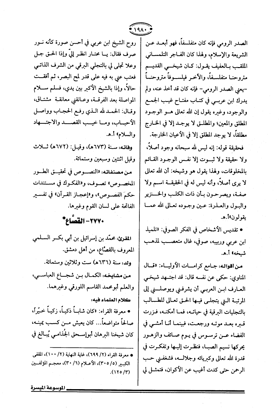 الصدر الرومي فإنه كان متفلسفًا، فهو أبعد عن الشريعة والإسلام، ولهذا كان الفاجر التلمساني الملقب بالعفيف يقول: كان شيخي القديم متروحنا متفلسفًا، والآخر فيلسوفًا متروحنًا -يعني الصدر الرومي- فإنه كان قد أخذ عنه، ولم يدرك ابن عربي في كتاب مفتاح غيب الجمع والوجود، وغيره يقول إن الله تعالى هو الوجود المطلق والمعين؛ والمطلق لا يوجد إلا في الخارج مطلقًا، لا يوجد المطلق إلا في الأعيان الخارجة.