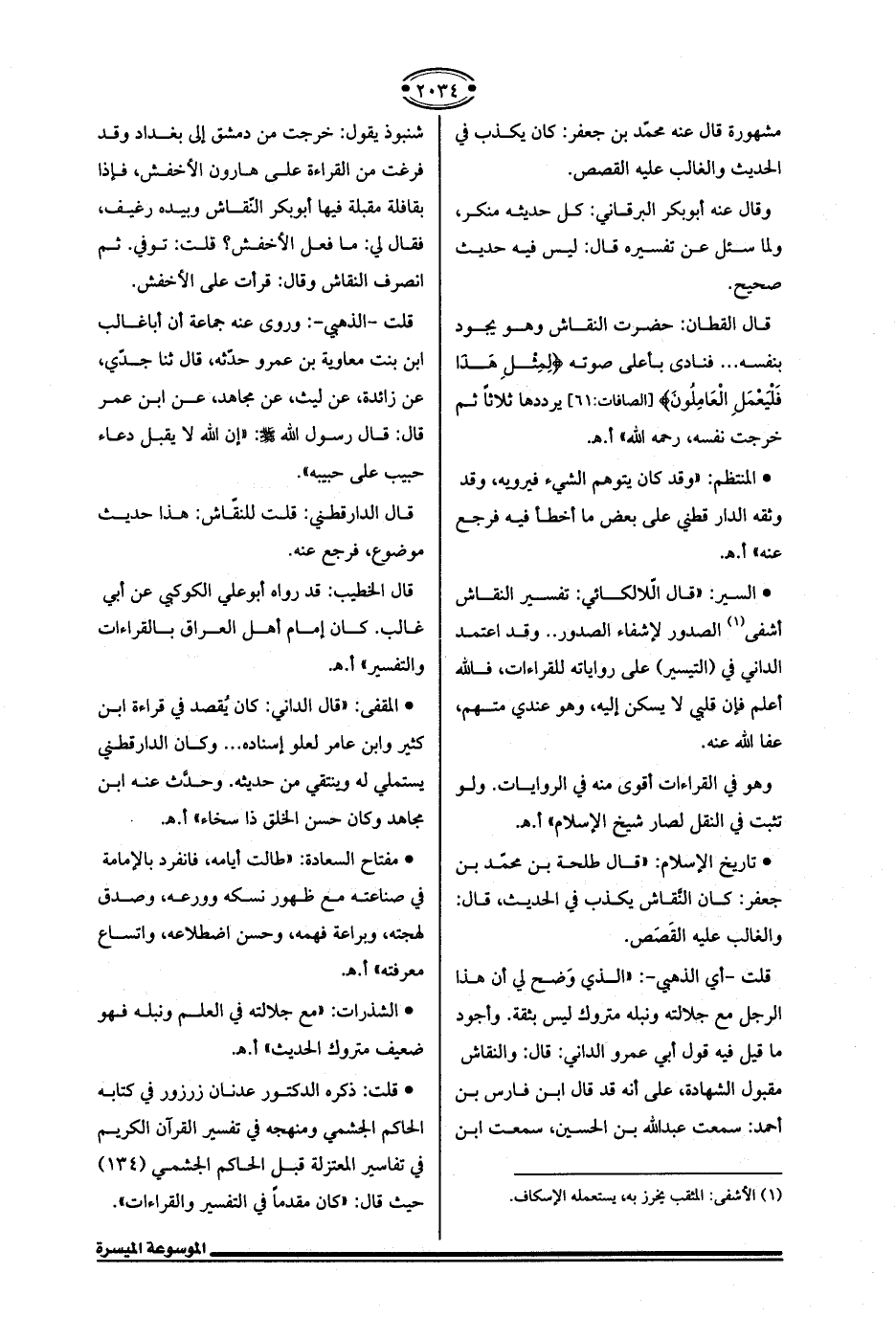 * السير: "قال اللَّالكائي: تفسير النقاش أشفى (¬1) الصدور لإشفاء الصدور .. وقد اعتمد الداني في (التيسير) على رواياته للقراءات، فالله أعلم فإن قلبي لا يسكن إليه، وهو عندي متّهم، عفا الله عنه.