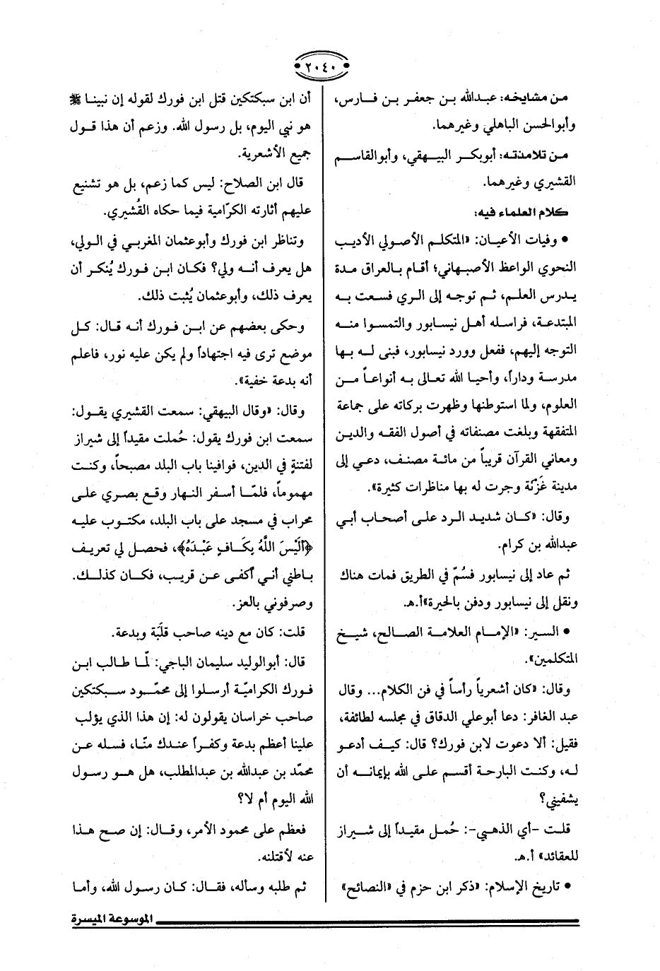 قال: أَبو الوليد سليمان الباجي: لمَّا طالب ابن فورك الكراميّة أرسلوا إلى محمّود سبكتكين صاحب خراسان يقولون له: إن هذا الذي يؤلب علينا أعظم بدعة وكفرًا عندك منّا، فسله عن محمّد بن عبد الله بن عبد المطلب، هل هو رسول الله اليوم أم لا؟