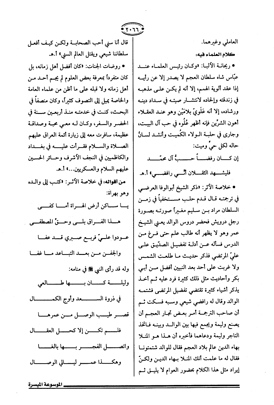 • ريحانة الألبا: "وكان رئيس العلماء عند عبّاس شاه سلطان العجم لا يصدر إلا عن رأيه إذا عقد ألوية الهمم، إلا أنه لم يكن علي مذهبه في زندقته وإلحاده لانتشار صيته في سداد دينه ورشاده، إلا أنه عَلَويّ بلامَين وهو عند العقلاء أهون الشرِّين فإنه أظهر عُلُوه في حب آل البيت، وجاري في حلبة الولاء الكُميت وأنشد لسانُ حاله لكل حيٍّ وميت: