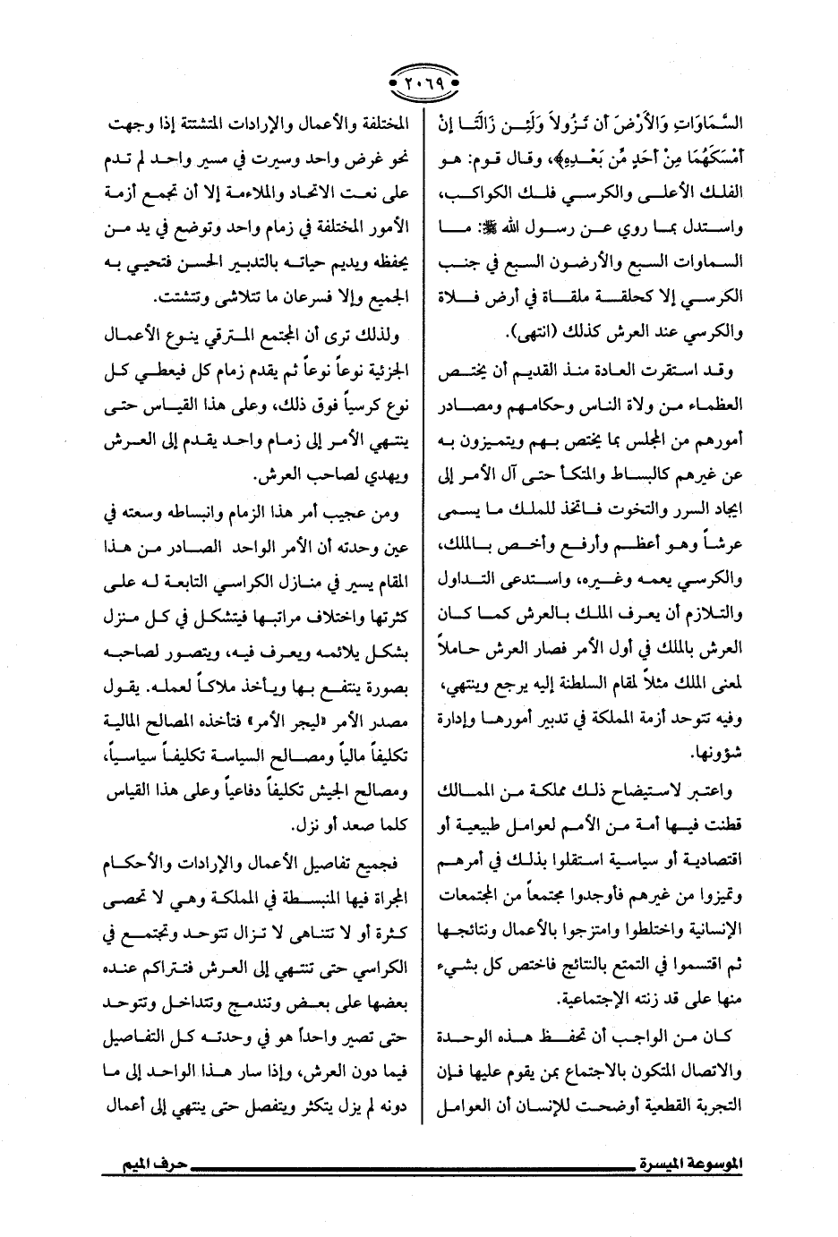 وقد استقرت العادة منذ القديم أن يختص العظماء من ولاة الناس وحكامهم ومصادر أمورهم من المجلس بما يختص بهم ويتميزون به عن غيرهم كالبساط والمتكأ حتى آل الأمر إلي إيجاد السرر والتخوت فاتخذ للملك ما يسمي عرشًا وهو أعظم وأرفع وأخص بالملك، والكرسي يعمه وغيره، واستدعي التداول والتلازم أن يعرف الملك بالعرش كما كان العرش بالملك في أول الأمر فصار العرش حاملًا لمعني الملك مثلًا لمقام السلطنة إليه يرجع وينتهي، وفيه تتوحد أزمة المملكة في تدبير أمورها وإدارة شؤونها.