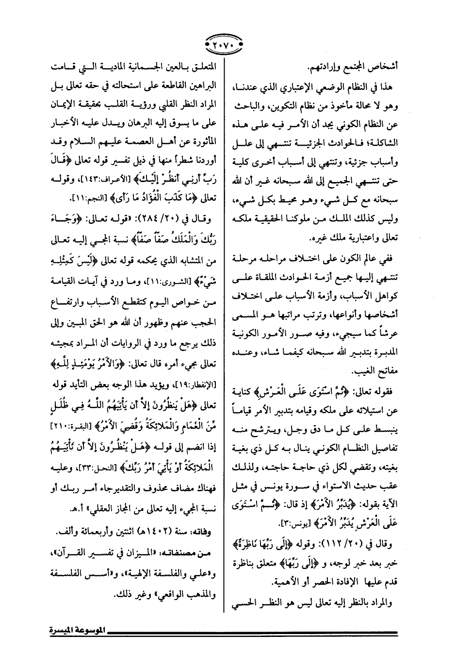 وقال في (20/ 284): "قوله تعالى: {وَجَاءَ رَبُّكَ وَالْمَلَكُ صَفًّا صَفًّا (22)} نسبة المجي إليه تعالي من المتشابه الذي يحكمه قوله تعالى {لَيسَ كَمِثْلِهِ شَيءٌ} [الشورى: 11]، وما ورد في آيات القيامة من خواص اليوم كتقطع الأسباب وارتفاع الحجب عنهم وظهور أن الله هو الحق المبين وإلي ذلك يرجع ما ورد في الروايات أن المراد بمجيئه تعالي مجيء أمره قال تعالي: {وَالْأَمْرُ يَوْمَئِذٍ لِلَّهِ} [الانفطار: 19]، ويؤيد هذا الوجه بعض التأيد قوله تعالي {هَلْ يَنْظُرُونَ إلا أَنْ يَأْتِيَهُمُ اللَّهُ فِي ظُلَلٍ مِنَ الْغَمَامِ وَالْمَلَائِكَةُ وَقُضِيَ الْأَمْرُ} [البقرة: 210] إذا انضم إلي قوله {هَلْ يَنْظُرُونَ إلا أَنْ تَأْتِيَهُمُ الْمَلَائِكَةُ أَوْ يَأْتِيَ أَمْرُ رَبِّكَ} [النحل: 33]، وعليه فهناك مضاف محذوف والتقدير جاء أمر ربك أو نسبة المجيء إليه تعالي من المجاز العقلي" أ. هـ.