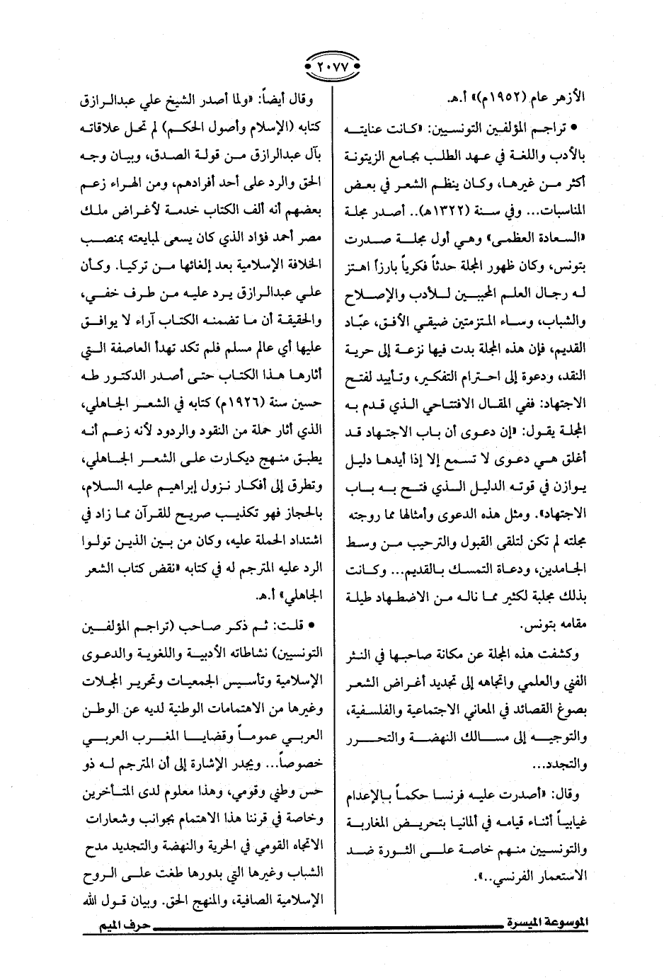 • قلت: ثم ذكر صاحب (تراجم المؤلفين التونسيين) نشاطاته الأدبية واللغوية والدعوي الإسلامية وتأسيس الجمعيات وتحرير المجلات وغيرها من الاهتمامات الوطنية لديه عن الوطن العربي عمومًا وقضايا المغرب العربي خصوصًا ... ويجدر الإشارة إلي أن المترجم له ذو حس وطني وقومي، وهذا معلوم لدي المتأخرين وخاصة في قرننا هذا الاهتمام بجوانب وشعارات الاتجاه القومي في الحرية والنهضة والتجديد مدح الشباب وغيرها التي بدورها طغت علي الروح الإسلامية الصافية، والمنهج الحق. وبيان قول الله