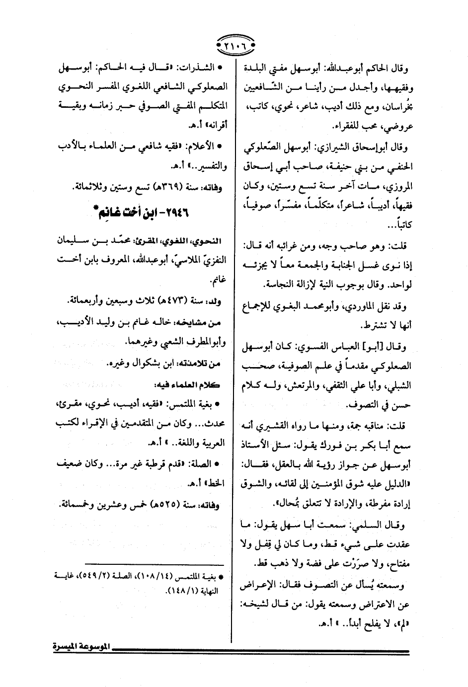 * الشذرات: "قال فيه الحاكم: أبو سهل الصعلوكي الشافعي اللغوي المفسر النحوي المتكلم المفتي الصوفي حبر زمانه وبقية أقرانه" أ. هـ.