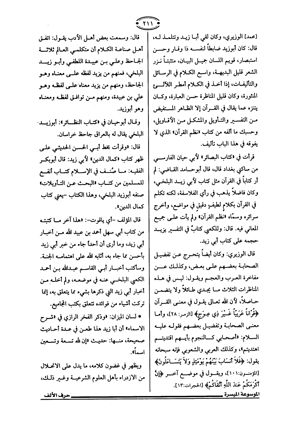 قرأت في "كتاب البصائر" لأبي حيان الفارسي من ساكني بغداد قال، قال أبو حامد القاضي: لم أر كتابًا في القرآن مثل كتاب لأبي زيد البلخي، وكان فاضلًا يذهب في رأي الفلاسفة، لكنه تكلم في القرآن بكلام لطيفٍ دقيقٍ في مواضع، وأخرج سرائره وسماه نظم القرآن" ولم يأت على جميع المعاني فيه. قال: وللكعبي كتابٌ في التفسير يزيد حجمه على كتاب أبي زيد.
