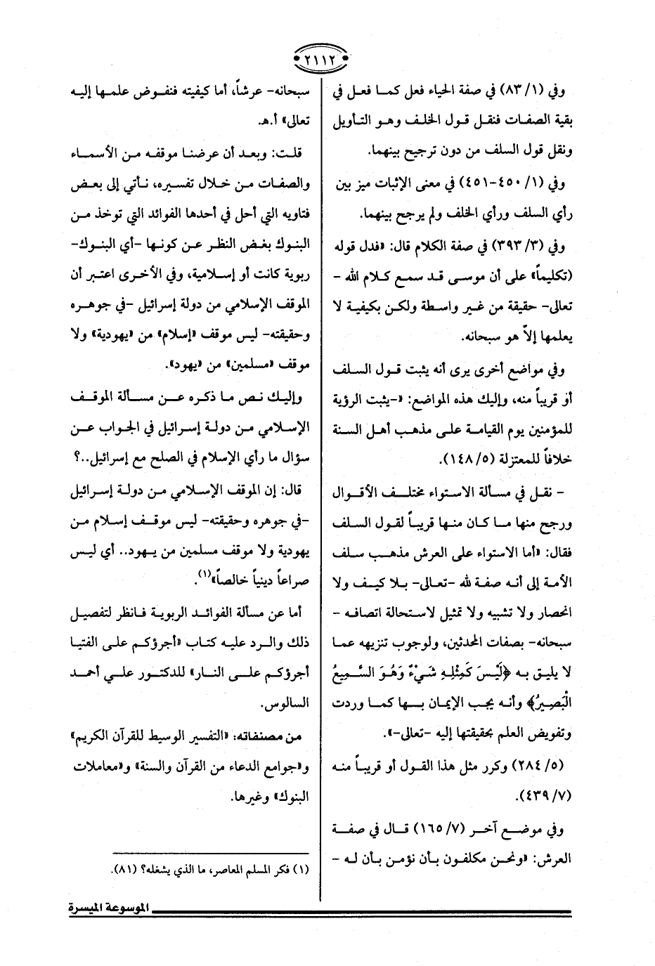 وفي موضع آخر (7/ 165) قال في صفة العرش: "ونحن مكلفون بأن نؤمن بأن له -سبحانه- عرشًا، أما كيفيته فنفوض علمها إليه تعالى" أ. هـ.