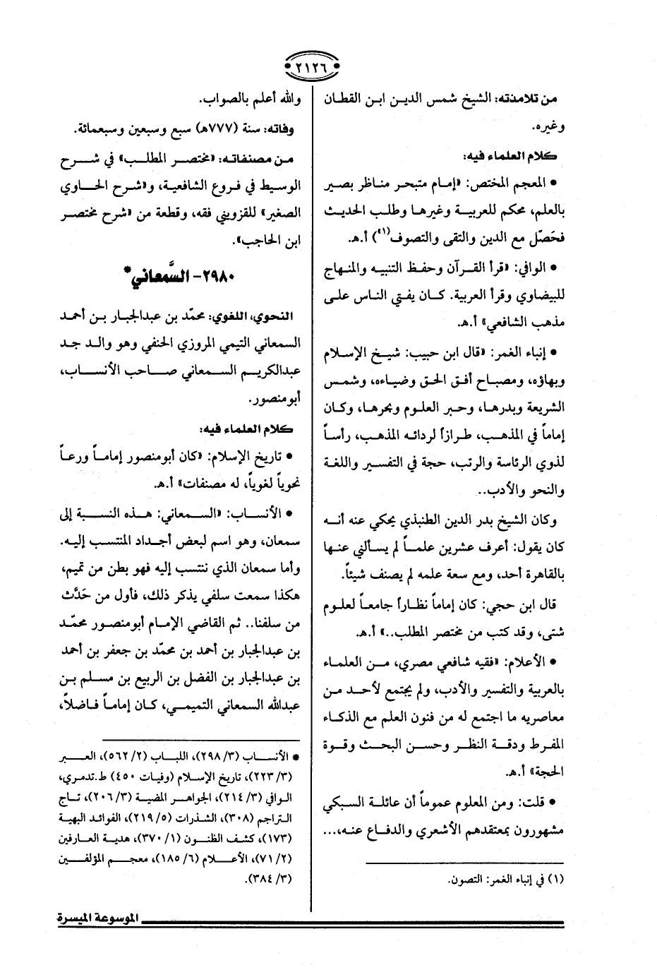 * الأنساب: "السمعاني: هذه النسبة إلى سمعان، وهو اسم لبعض أجداد المنتسب إليه. وأما سمعان الذي ننتسب إليه فهو بطن من تميم، هكذا سمعت سلفي يذكر ذلك، فأول من حَدَّث من سلفنا .. ثم القاضي الإمام أبو منصور محمّد بن عبد الجبار بن أحمد بن محمّد بن جعفر بن أحمد بن عبد الجبار بن الفضل بن الربيع بن مسلم بن عبد الله السمعاني التميمي، كان إمامًا فاضلًا،