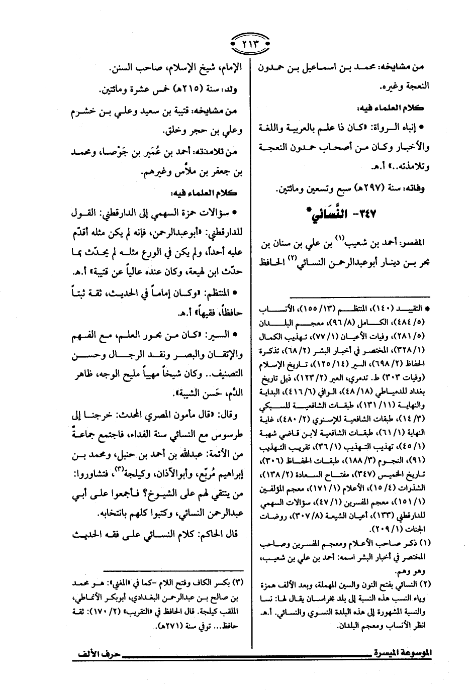 (¬2) النسائي بفتح النون والسين المهملة، وبعد الألف همزة وياء النسب هذه النسبة إلى بلد بخراسان يقال لها: نسا والنسبة المشهورة إلى هذه البلدة النسوي والنسائي. أ. هـ. انظر الأنساب ومعجم البلدان.