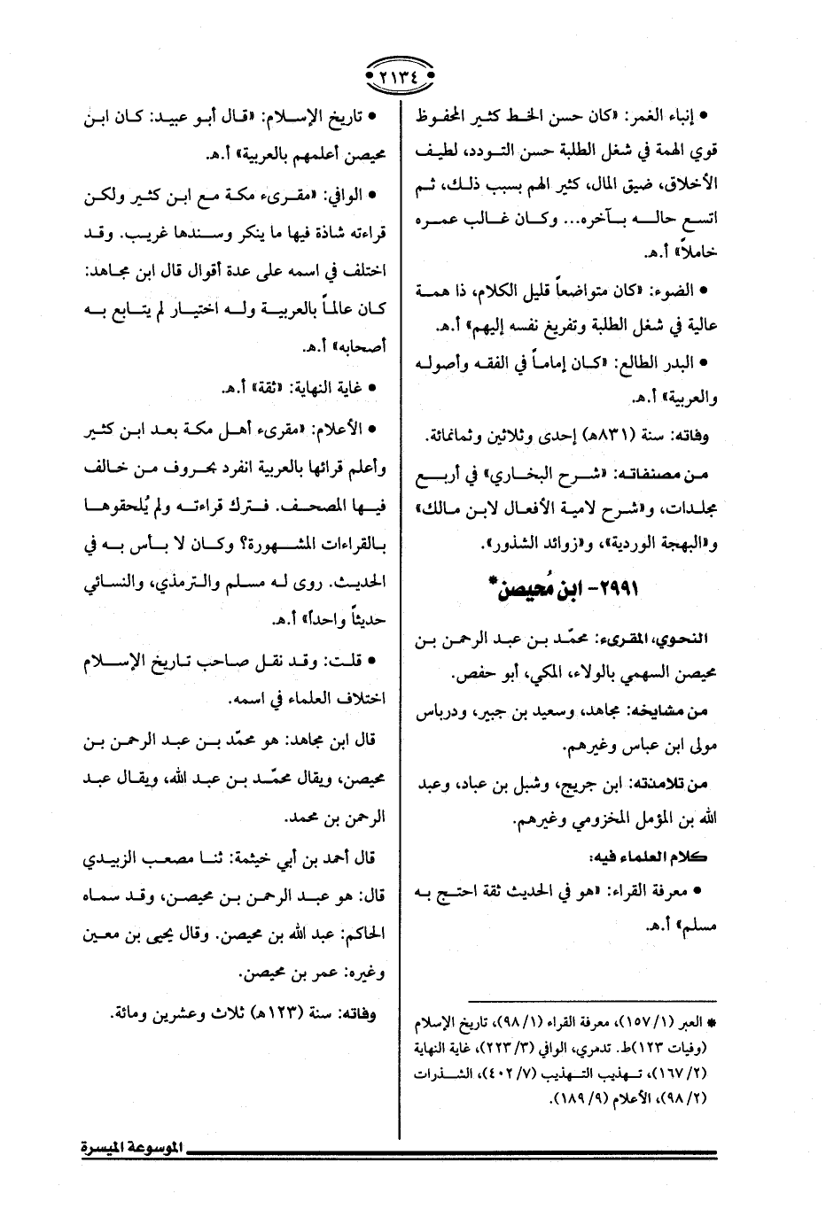 * تاريخ الإسلام: "قال أبو عبيد: كان ابن محيصن أعلمهم بالعربية" أ. هـ.