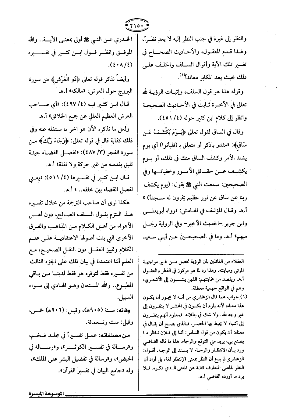 وقال في الساق لقول تعالى {يَوْمَ يُكْشَفُ عَنْ سَاقٍ}: "مقدر باذكر أو متعلق بـ (فليأتوا) أي يوم يشتد الأمر وكشف الساق منك في ذلك، أو يوم يكشف عن حقائق الأمور وخفياتها وفي الصحيحين: سمعت النبي - صلى الله عليه وسلم - يقول: (يوم يكشف ربنا عن ساق عن نور عظيم يخرون له سجدًا) " أ. هـ. وقال المؤلف في الهامش: "رواه أبو يعلى وابن جرير -الحديث الأخير- وفي الرواية رجل مبهم" أ. هـ. وما في الصحيحين عن أبي سعيد الخدري عن النبي - صلى الله عليه وسلم - أولى بمعنى الآية .. والله الموفق وانظر قول ابن كثير في تفسيره وأيضًا نذكر قوله تعالى {ذُو الْعَرْشِ} من سورة البروج حول العرش: "مالكه" أ. هـ.
