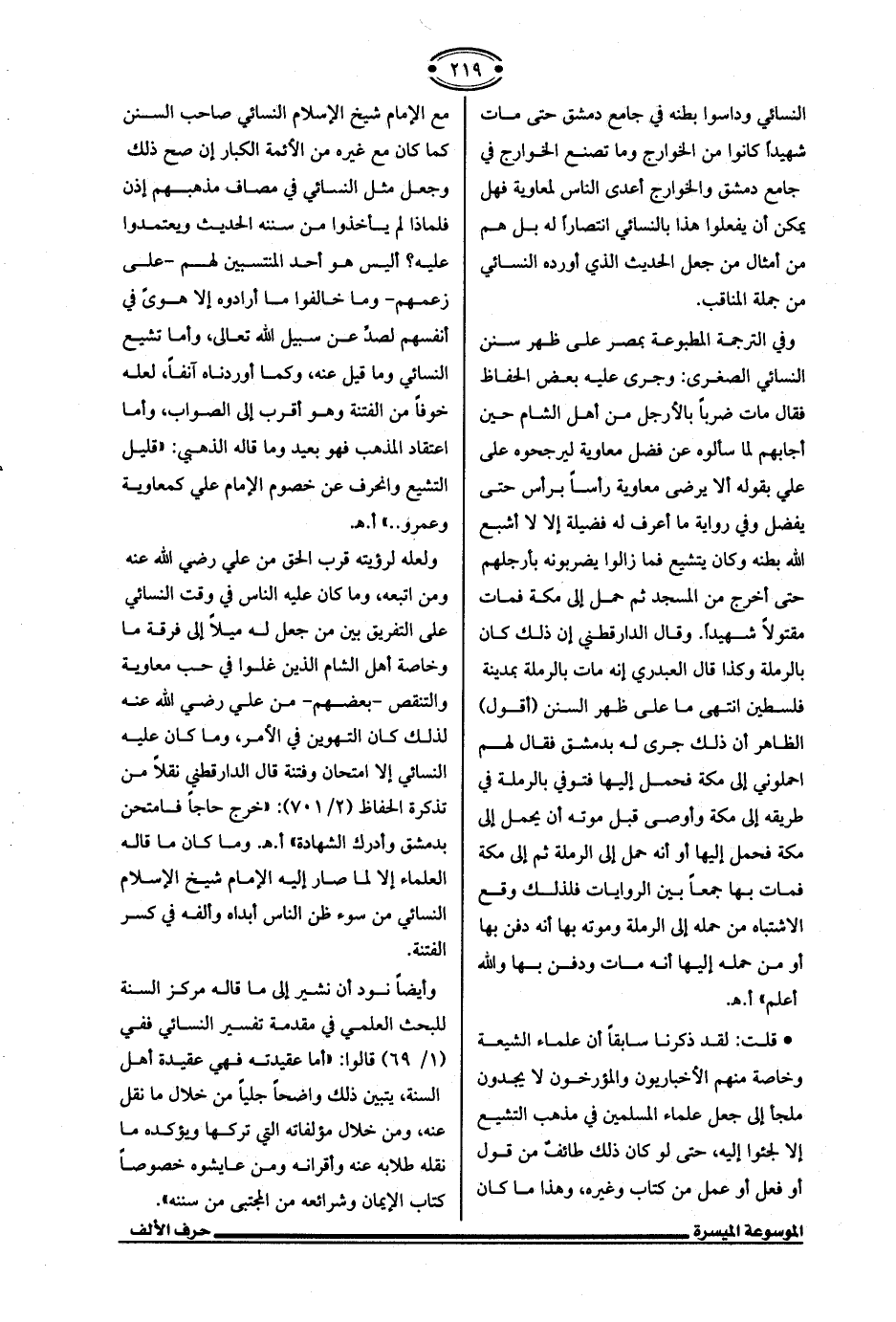 وفي الترجمة المطبوعة بمصر على ظهر سنن النسائي الصغرى: وجرى عليه بعض الحفاظ فقال مات ضربًا بالأرجل من أهل الشام حين أجابهم لما سألوه عن فضل معاوية ليرجحوه على علي بقوله ألا يرضى معاوية رأسًا برأس حتى يفضل وفي رواية ما أعرف له فضيلة إلا لا أشبع الله بطنه وكان يتشيع فما زالوا يضربونه بأرجلهم حتى أخرج من المسجد ثم حمل إلى مكة فمات مقتولًا شهيدًا. وقال الدارقطني إن ذلك كان بالرملة وكذا قال العبدري إنه مات بالرملة بمدينة فلسطين انتهى ما على ظهر السنن (أقول) الظاهر أن ذلك جرى له بدمشق فقال لهم احملوني إلى مكة فحمل إليها فتوفي بالرملة في طريقه إلى مكة وأوصى قبل موته أن يحمل إلى مكة فحمل إليها أو أنه حمل إلى الرملة ثم إلى مكة فمات بها جمعًا بين الروايات فلذلك وقع الاشتباه من حمله إلى الرملة وموته بها أنه دفن بها أو من حمله إليها أنه مات ودفن بها والله أعلم" أ. هـ.