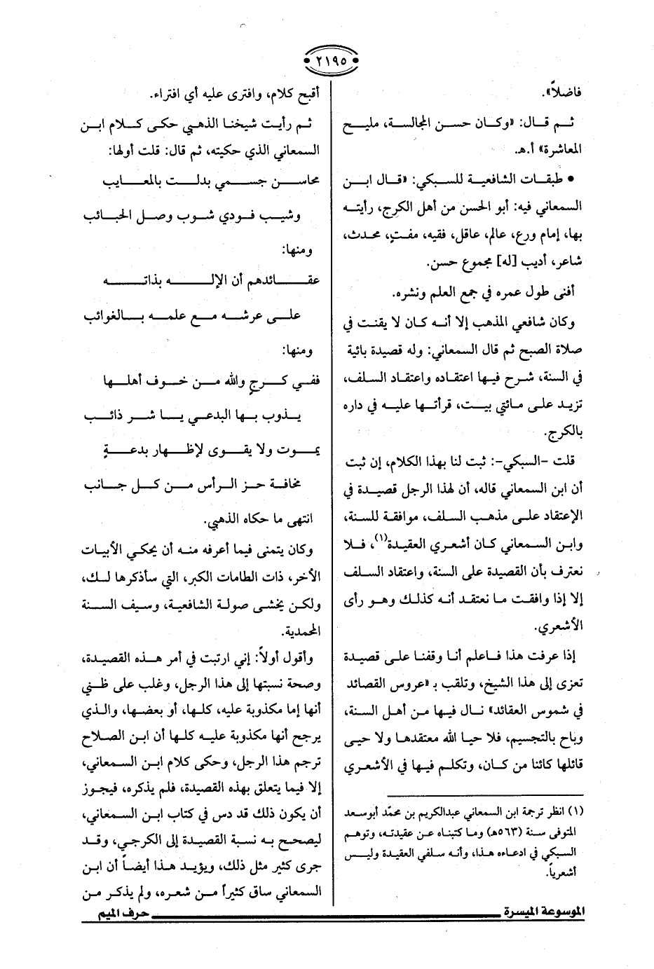قلت -السبكي-: ثبت لنا بهذا الكلام، إن ثبت أن ابن السمعاني قاله، أن لهذا الرجل قصيدة في الإعتقاد على مذهب السلف، موافقة للسنة، وابن السمعاني كان أشعري العقيدة (1)، فلا نعترف بأن القصيدة على السنة، واعتقاد السلف إلا إذا وافقت ما نعتقد أنه كذلك وهو رأى الأشعري.
