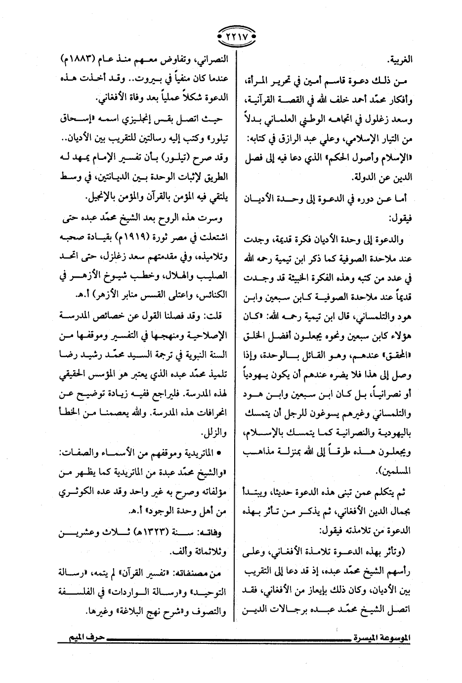 (وتأثر بهذه الدعوة تلامذة الأفغاني، وعلى رأسهم الشيخ محمّد عبده، إذ قد دعا إلى التقريب بين الأديان، وكان ذلك بإيعاز من الأفغاني، فقد اتصل الشيخ محمّد عبده برجالات الدين النصراني، وتفاوض معهم منذ عام (1883 م) عندما كان منفيًا في بيروت .. وقد أخذت هذه الدعوة شكلًا عمليًّا بعد وفاة الأفغاني.
