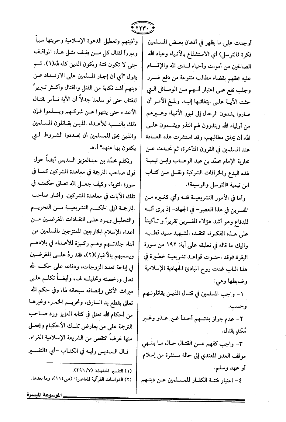4 - اعتبار فتنة الكفار للمسلمين عن دينهم وأذيتهم وتعطيل الدعوة الإسلامية وحريتها سببًا ومبررًا لقتال كل من يقف مثل هذه المواقف حتى لا تكون فتنة ويكون الدين كله لله (¬1). ثم يقول "أي أن إجبار المسلمين على الارتداد عن دينهم أشد نكاية من القتل والقتال وأكثر تبريرًا للقتال حتى لو سلمنا جدلًا أن الآية تأمر بقتال الأعداء حتى ينتهوا عن شركهم ويسلموا فإن ذلك بالنسبة للأعداء الذين يقاتلون المسلمين والذين يحق للمسلمين أن يحددوا الشروط التي يكفون بها عنهم" أ. هـ.