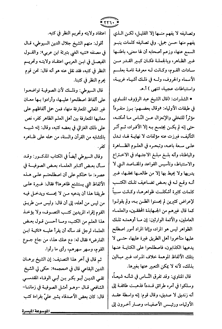 • الشذرات: (قال الشيخ عبد الرؤوف المناوي في طبقات الأولياء: (وقال بعضهم: برز منفردًا مؤثرًا للتخلي والإنعزال عن الناس ما أمكنه، حتى إنه لم يكن يجتمع به إلا الأفراد، ثم آثر التآليف، فبرزت عنه مؤلفات لا نهاية لها، تدل على سعة باعه، وتبحره في العلوم الظاهرة والباطنة، وأنه بلغ مبلغ الاجتهاد في الاختراع والاستنباط، وتأسيس القواعد والمقاصد التي لا يدريها ولا يحيط بها إلا من طالعها بحقها، غير أنه وقع له في بعض تضاعيف تلك الكتب كلمات كثيرة أشكلت ظواهرها، وكانت سببًا لإعراض كثيرين لم يحسنوا الظن به، ولم يقولوا كما قال غيرهم من الجهابذة المحققين، والعلماء العاملين، والأئمة الوارثين: إن ما أوهمته تلك الظواهر ليس هو المراد، وإنما المراد أمور اصطلح عليها متأخروا أهل الطريق غيرة عليها، حتى لا يدعيها الكذابون، فاصطلحوا على الكناية عنها بتلك الألفاظ الموهمة خلاف المراد، غير بالين بذلك، لأنه لا يمكن التعبير عنها بغيرها.