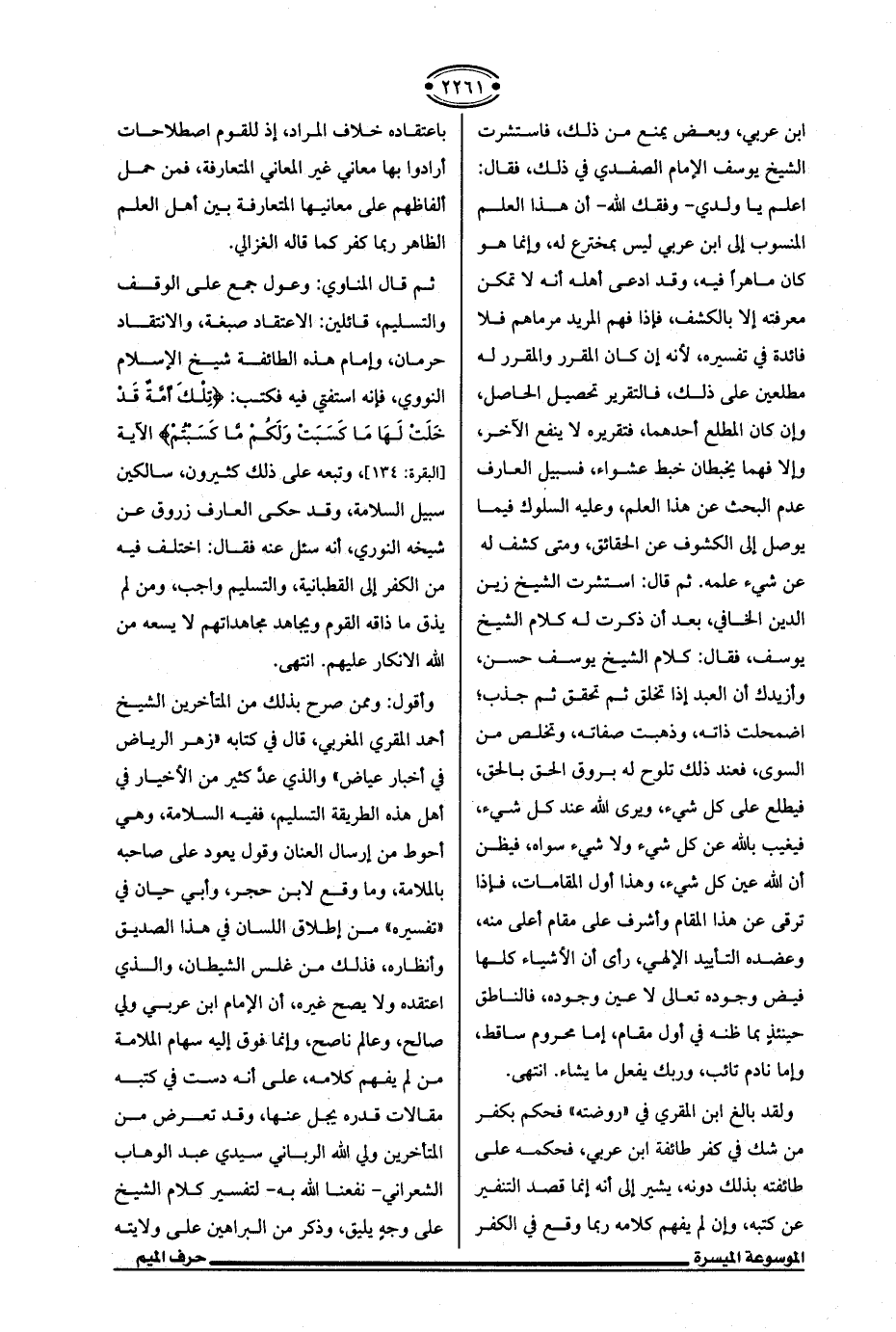 ولقد بالغ ابن المقري في "روضته" فحكم بكفر من شك في كفر طائفة ابن عربي، فحكمه على طائفته بذلك دونه، يشير إلى أنه إنما قصد التنفير عن كتبه، وإن لم يفهم كلامه ربما وقع في الكفر باعتقاده خلاف المراد، إذ للقوم اصطلاحات أرادوا بها معاني غير المعاني المتعارفة، فمن حمل ألفاظهم على معانيها المتعارفة بين أهل العلم الظاهر ربما كفر كما قاله الغزالي.