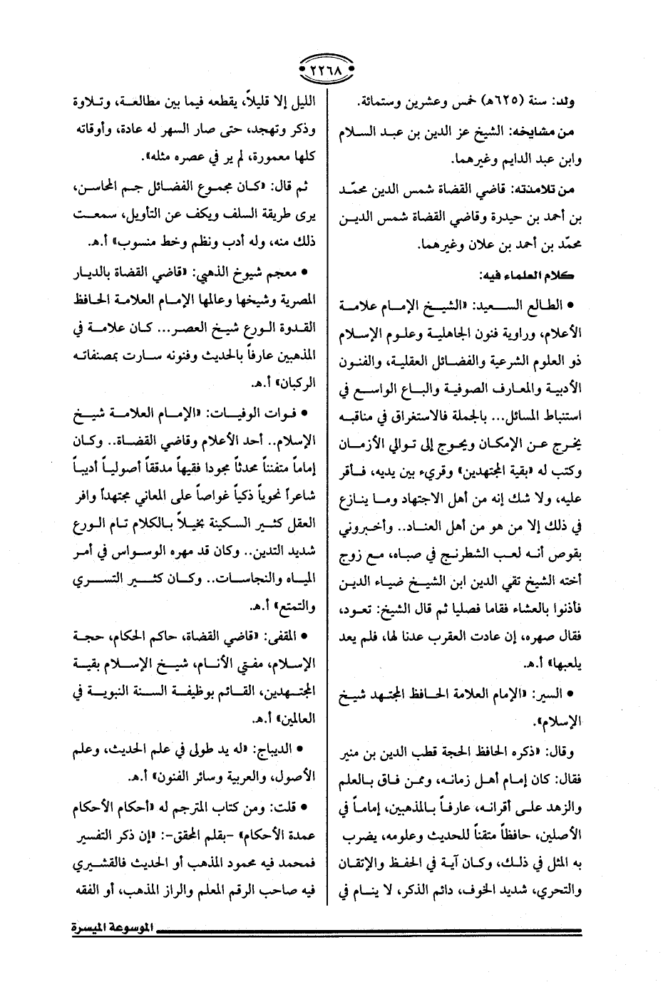 • قلت: ومن كتاب المترجم له "أحكام الأحكام عمدة الأحكام" -بقلم المحقق-: "إن ذكر التفسير فمحمد فيه عمود المذهب أو الحديث فالقشيري فيه صاحب الرقم المعلم والراز المذهب، أو الفقه