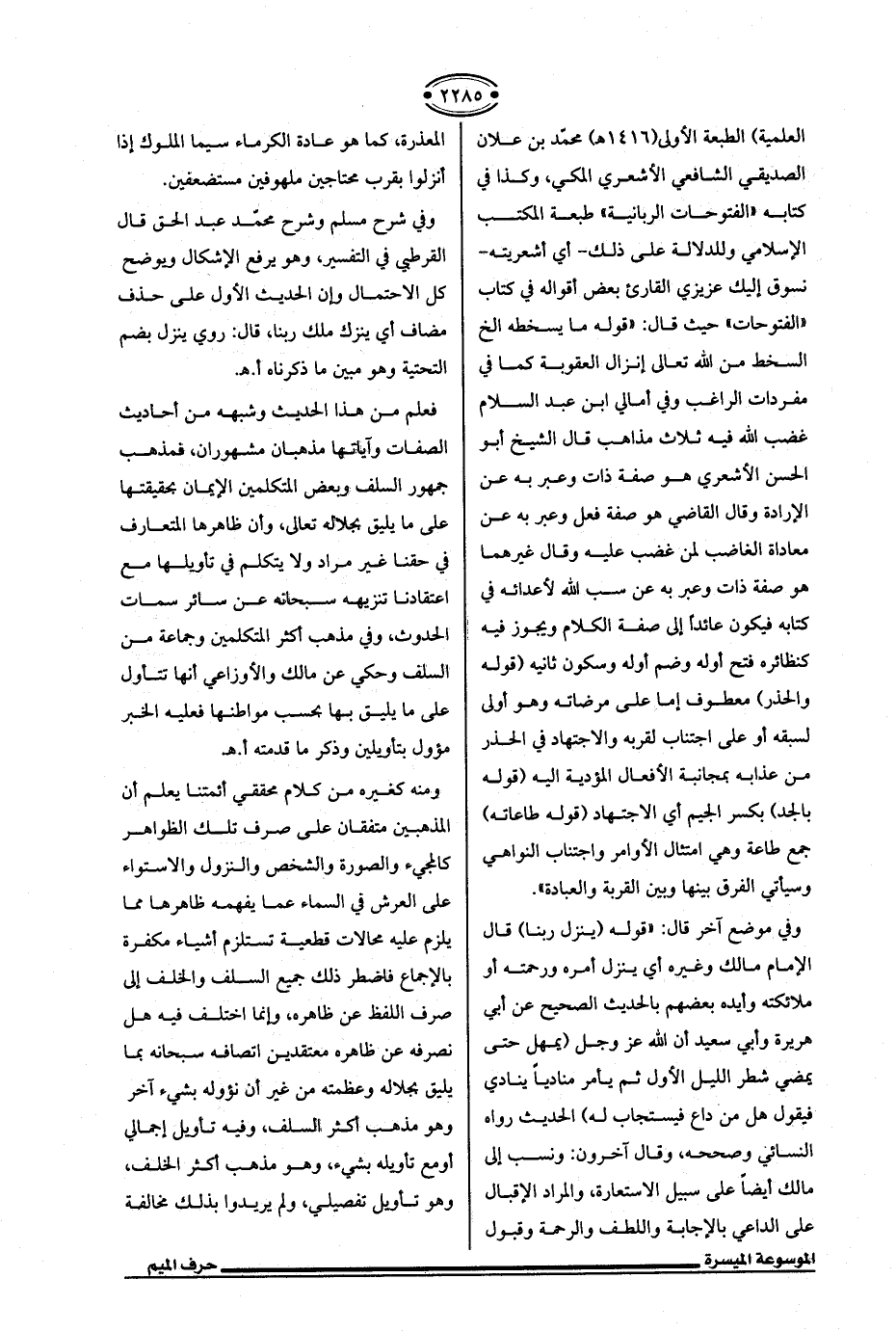 وفي شرح مسلم وشرح محمّد عبد الحق قال القرطبي في التفسير، وهو يرفع الإشكال ويوضح كل الاحتمال وإن الحديث الأول على حذف مضاف أي ينزك ملك ربنا، قال: روي ينزل بضم التحتية وهو مبين ما ذكرناه أ. هـ.