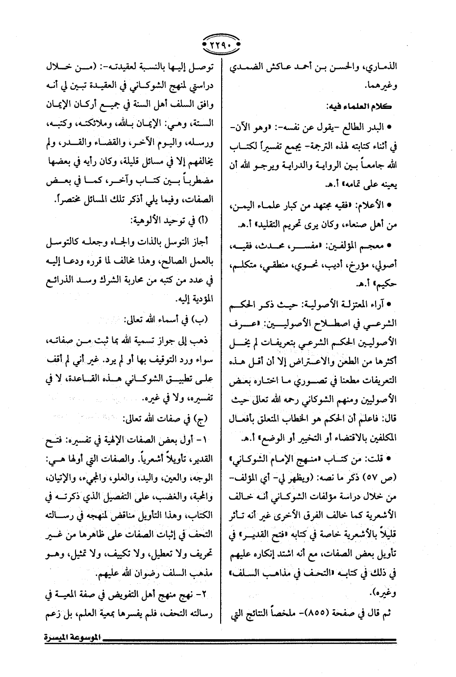 ثم قال في صفحة (855) -ملخصًا النتائج التي توصل إليها بالنسبة لعقيدته-: (من خلال دراستي لمنهج الشوكاني في العقيدة تبين لي أنه وافق السلف أهل السنة في جميع أركان الإيمان الستة، وهي: الإيمان بالله، وملائكته، وكتبه، ورسله، واليوم الآخر، والقضاء والقدر، ولم يخالفهم إلا في مسائل قليلة، وكان رأيه في بعضها مضطربًا بين كتاب وآخر، كما في بعض الصفات، وفيما يلي أذكر تلك المسائل مختصرًا.