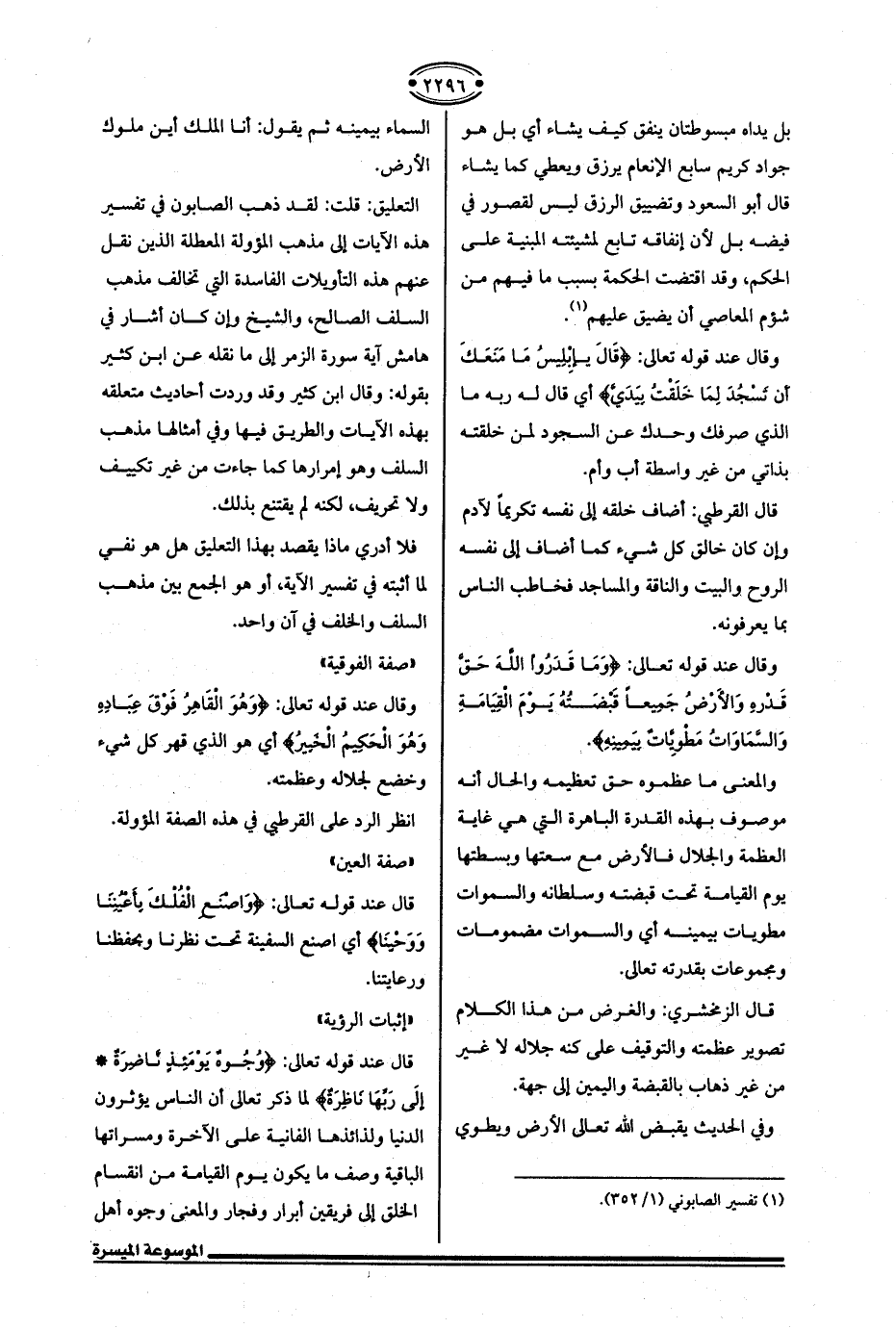 التعليق: قلت: لقد ذهب الصابون في تفسير هذه الآيات إلى مذهب المؤولة المعطلة الذين نقل عنهم هذه التأويلات الفاسدة التي تخالف مذهب السلف الصالح، والشيخ وإن كان أشار في هامش آية سورة الزمر إلى ما نقله عن ابن كثير بقوله: وقال ابن كثير وقد وردت أحاديث متعلقه بهذه الآيات والطريق فيها وفي أمثالها مذهب السلف وهو إمرارها كما جاءت من غير تكييف ولا تحريف، لكنه لم يقتنع بذلك.
