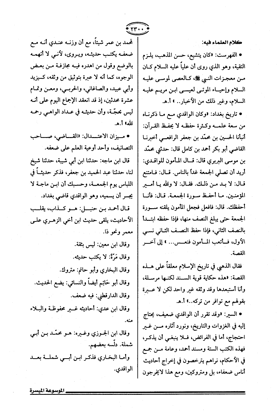 • السير: "وقد تقرر أن الواقدي ضعيف، يحتاج إليه في الغزوات والتاريخ، ونورد آثاره من غير احتجاج، أما في الفرائض، فلا ينبغي أن يذكر، فهذه الكتب الستة ومسند أحمد، وعامة من جمع في الأحكام، نراهم يترخصون في إخراج أحاديث أناس ضعفاء، بل ومتروكين، ومع هذا لا يخرجون لمحمد بن عمر شيئًا، مع أن وزنه عندي أنه مع ضعفه يكتب حديثه، ويروى، لأني لا أتهمه بالوضع وقول من اهدره فيه مجازفة من بعض الوجوه، كما أنه لا عبرة بتوثيق من وثقه، كيزيد وأبي عبيد، والصاغاني، والحربي، ومعن وتمام عشرة محدثين، إذ قد انعقد الإجماع اليوم على أنه ليس بحجّة، وأن حديثه في عداد الواهي رحمه الله" أ. هـ.