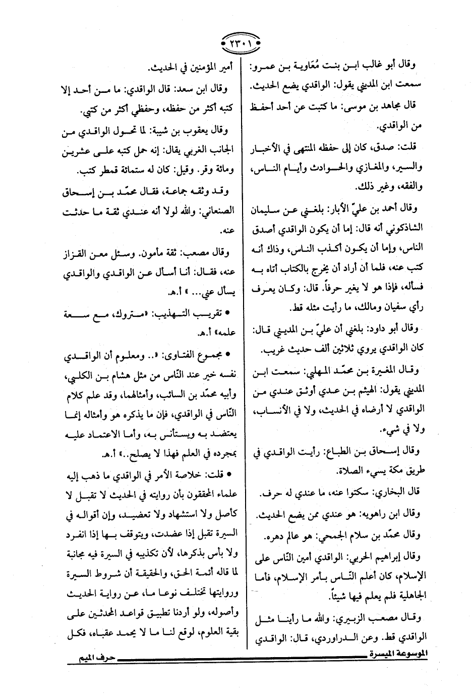 • قلت: خلاصة الأمر في الواقدي ما ذهب إليه علماء المحققون بأن روايته في الحديث لا تقبل لا كأصل ولا استشهاد ولا تعضيد، وإن أقواله في السيرة تقبل إذا عضدت، ويتوقف بها إذا انفرد ولا بأس بذكرها، لأن تكذيبه في السيرة فيه مجانبة لما قاله أئمة الحق، والحقيقة أن شروط السيرة وروايتها تختلف نوعا ما، عن رواية الحديث وأصوله، ولو أردنا تطبيق قواعد المحدثين على بقية العلوم، لوقع لنا ما لا يحمد عقباه، فكل