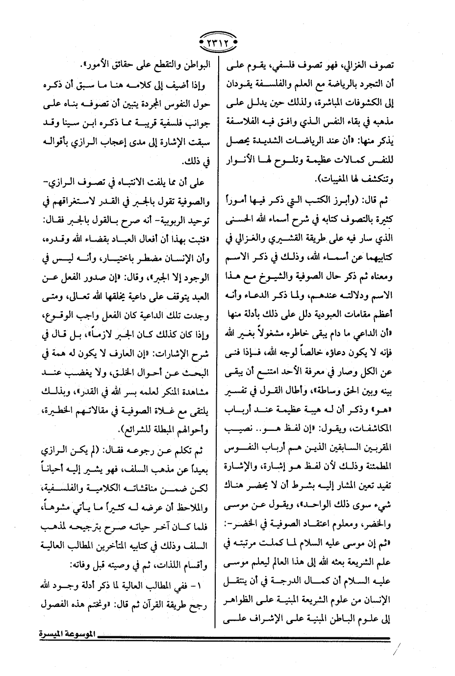 على أن مما يلفت الانتباه في تصوف الرازي -والصوفية تقول بالجبر في القدر لاستغراقهم في توحيد الربوبية- أنه صرح بالقول بالجبر فقال: "فثبت بهذا أن أفعال العباد بقضاء الله وقدره، وأن الإنسان مضطر باختيار، وأنه ليس في الوجود إلا الجبر"، وقال: "إن صدور الفعل عن العبد يتوقف على داعية يخلقها الله تعالى، ومتى وجدت تلك الداعية كان الفعل واجب الوقوع، وإذا كان كذلك كان الجبر لازمًا"، بل قال في شرح الإشارات: "إن العارف لا يكون له همة في البحث عن أحوال الخلق، ولا يغضب عند مشاهدة المنكر لعلمه بسر الله في القدر"، وبذلك يلتقى مع غلاة الصوفية في مقالاتهم الخطيرة، وأحوالهم المبطلة للشرائع).