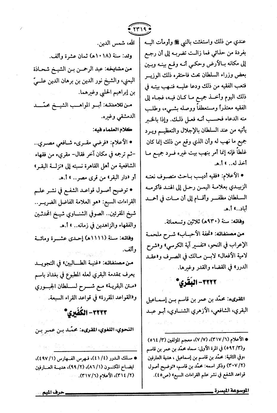 • الأعلام: "فرضي مقرئ شافعي مصري. . -ثم ترجمه في مكان آخر فقال- مقريء من فقهاء الشافعية من أهل القاهرة نسبته إلى "نزلة البقر" أو "دار البقر" من قرى مصر. ." أ. هـ.