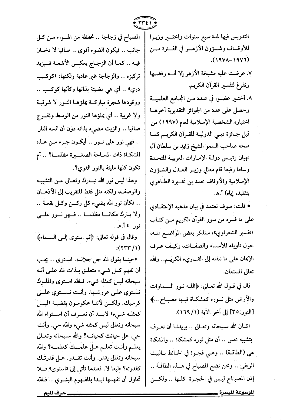 "كأن الله سبحانه وتعالى .. يريدنا أن نعرف بتشبيه محس .. أن مثل نوره كمشكاة .. والمشكاة هي (الطاقة) .. وهي فجوة في الحائط بالبيت الريفي .. ونحن نضع المصباح في هذه الطاقة .. إذن المصباح ليس في الحجرة كلها .. ولكن المصباح في زجاجة .. تحفظه من الهواء من كل جانب .. فيكون الضوء أقوى .. صافيا لا دخان فيه .. كما أن الزجاج يعكس الأشعة فيزيد تركيزه .. والزجاجة غير عادية ولكنها: "كوكب دري" .. أي هي مضيئة بذاتها وكأنها كوكب .. ووقودها شجرة مباركة يملؤها النور لا شرقية ولا غربية .. أي يملؤها النور من الوسط ويخرج صافيا .. والزيت مضيء بذاته دون أن تمسه النار .. فهي نور على نور .. أيكون جزء من هذه المشكاة ذات المساحة الصغيرة مظلما؟ .. أم تكون كلها مليئة بالنور القوي؟ .
