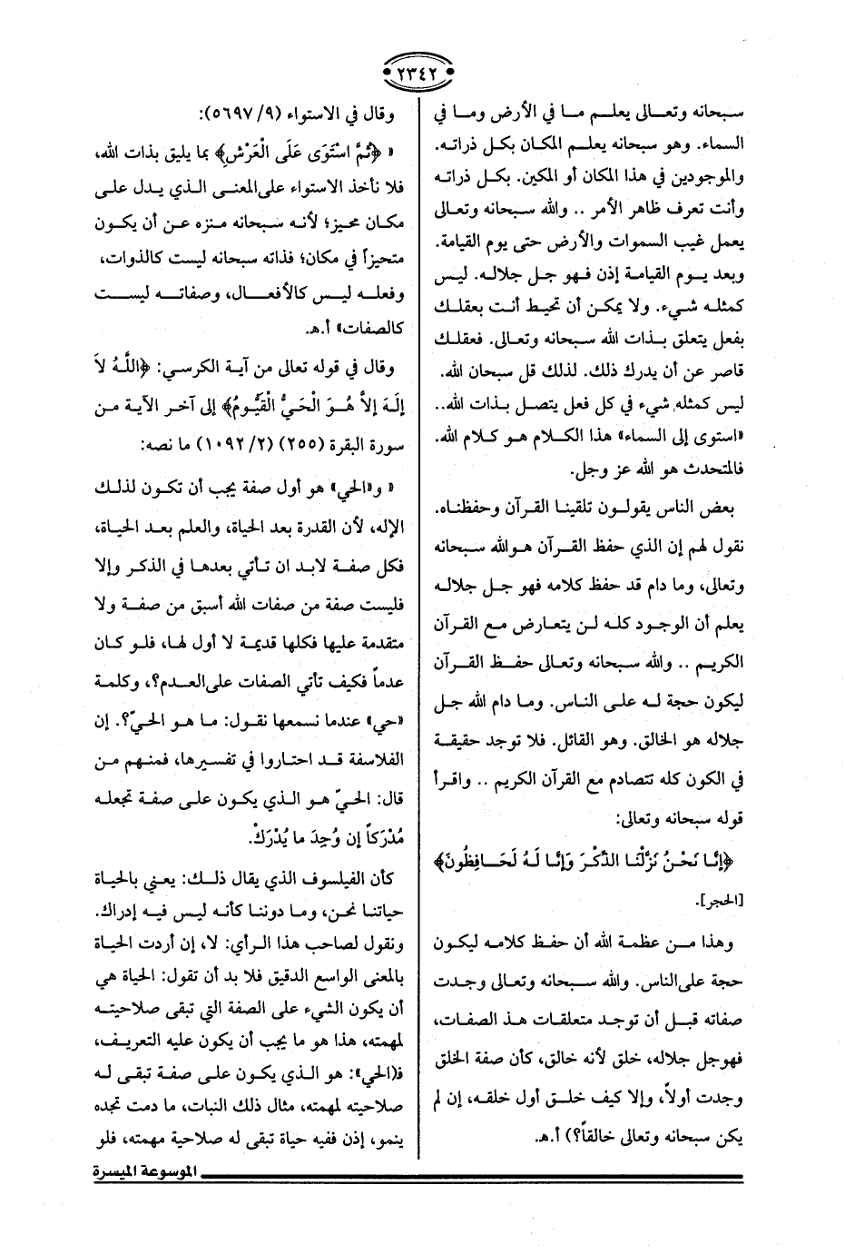 وقال في قوله تعالى من آية الكرسي: {اللَّهُ لَا إِلَهَ إلا هُوَ الْحَيُّ الْقَيُّومُ} إلى آخر الآية من سورة البقرة (255) (2/ 1920) ما نصه: "و"الحي" هو أول صفة يجب أن تكون لذلك الإله، لأن القدرة بعد الحياة، والعلم بعد الحياة، فكل صفة لا بد أن تأتي بعدها في الذكر وإلا فليست صفة من صفات الله أسبق من صفة ولا متقدمة عليها فكلها قديمة لا أول لها، فلو كان عدمًا فكيف تأتي الصفات على العدم؟ ، وكلمة "حي" عندما نسمعها نقول: ما هو الحيّ؟ . إن الفلاسفة قد احتاروا في تفسيرها، فمنهم من قال: الحيّ هو الذي يكون على صفة تجعله مُدرَكا إن وُجدَ ما يُدرَكْ.
