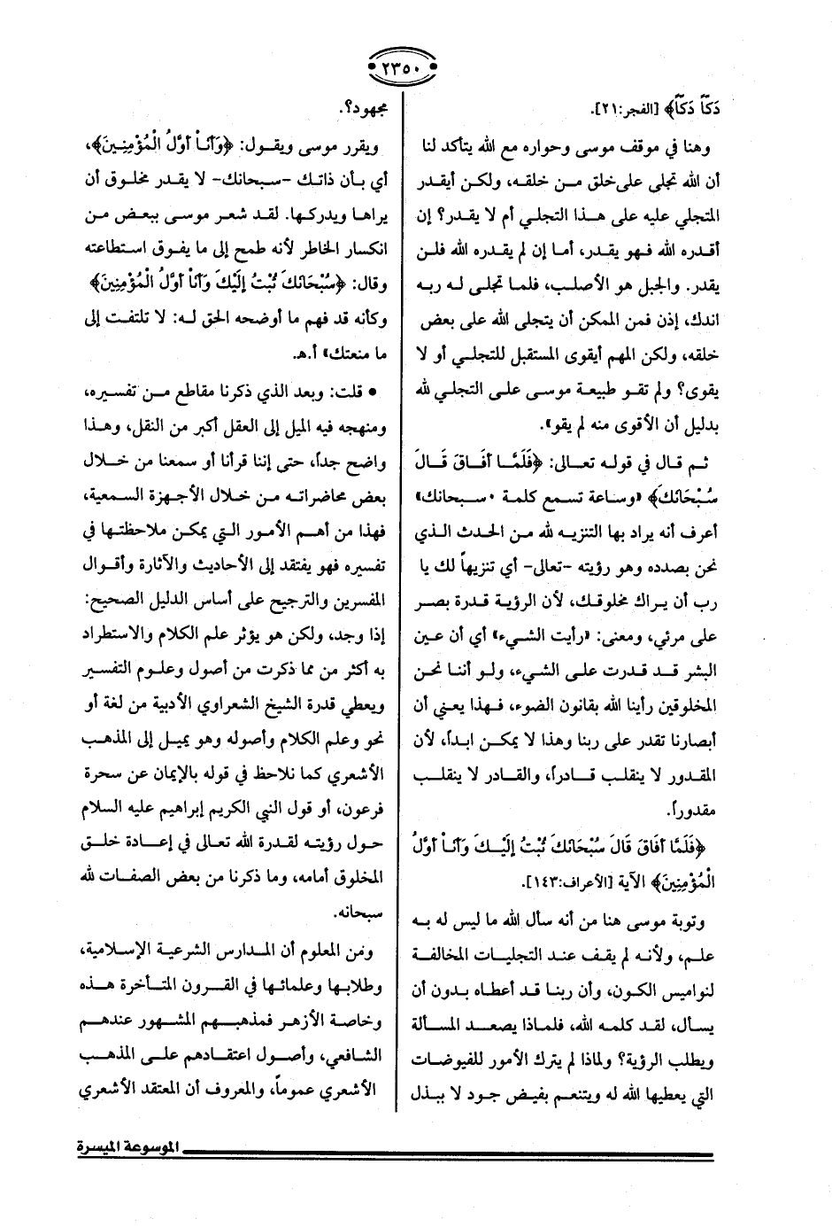 وتوبة موسى هنا من أنه سأل الله ما ليس له به علم، ولأنه لم يقف عند التجليات المخالفة لنواميس الكون، وأن ربنا قد أعطاه بدون أن يسأل، لقد كلمه الله، فلماذا يصعد المسألة ويطلب الرؤية؟ ولماذا لم يترك الأمور للفيوضات التي يعطيها الله له ويتنعم بفيض جود لا ببذل مجهود؟ .