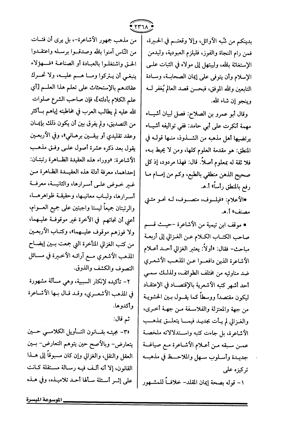 • موقف ابن تيمية من الأشاعرة -حيث قسم صاحب الكتاب الكلام عن الغزالي إلى أربعة مباحث- فقال: "أولًا: يعتبر الغزالي أحد أعلام الأشاعرة الذين دافعوا عن المذهب الأشعري ضد مناوئيه من مختلف الطوائف، ولذلك سمي أحد أشهر كتبه الأشعرية بالإقتصاد في الإعتقاد ليكون مقتصدًا ووسطًا كما يقول بين الحشوية من جهة والمعتزلة والفلاسفة من جهة أخرى، والغزالي لم يأت بحديد فيما يتعلق بمذهب الأشاعرة، بل جاءت كتبه واستدلالاته ملخصة عمن سبقه من أعلام الأشاعرة مع صياغة جديدة وأسلوب سهل والملاحظ في مذهبه تركيزه على: