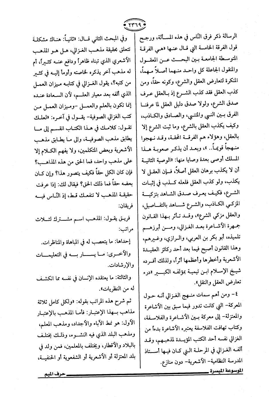 وفي المبحث الثاني قال: "ثانيًا: هناك مشكلة تتعلق بحقيقة مذهب الغزالي، هل هو المذهب الأشعري الذي تبناه ظاهرًا ودافع عنه كثيرًا، أم له مذهب آخر يذكره لخاصته وأومأ إليه في كثير من كتبه؟ ، يقول الغزالي في كتابه ميزان العمل الذي ألفه بعد معيار العلم، لأن السعادة عنده إنما تكون بالعلم والعمل -وميزان العمل من كتب الغزالي الصوفية- يقول في آخره: "لعلك تقول: كلامك في هذا الكتاب انقسم إلى ما يطابق مذهب الصوفية، وإلى ما يطابق مذهب الأشعرية وبعض المتكلمين، ولا يفهم الكلام إلا على مذهب واحد، فما الحق من هذه المذاهب؟ فإن كان الكل حقًّا فكيف يتصور هذا؟ كان كان بعضه حقًّا فما ذلك الحق؟ فيقال لك: إذا عرفت حقيقة المذهب لا تنفعك قط، إذ الناس فيه فريقان: