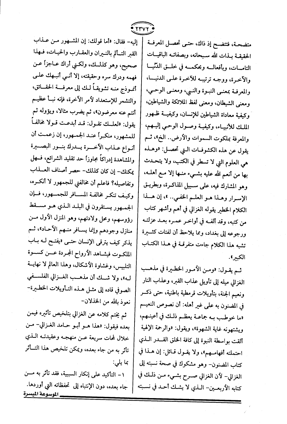 ثم يقول: "ومن الأمور الخطيرة في مذهب الغزالي ميله إلى تأويل عذاب القبر، وعذاب النار ونعيم الجنة، بتأويلات قرمطية باطنية، حتى ذكر في المضنون به على غير أهله: أن نصوص النعيم "ما خوطب به جماعة يعظم ذلك في أعينهم ويشتهونه غاية الشهوة"، ويقول: "والرحمة الإلهية ألقت بواسطة النبوة إلى كافة الخلق القدر الذي احتملته أفهامهم"، ولا يقول قائل: إن هذا كتاب المضنون -وهو مشكوك في صحة نسبته إلى الغزالي- لأن الغزالي صرح بشيء من ذلك في كتابه الأربعين -الذي لا يشك أحد في نسبته إليه- فقال: "أما قولك: إن المشهور من عذاب القبر التألم بالنيران والعقارب والحيات، فهذا صحيح، وهو كذلك، ولكني أراك عاجزًا عن فهمه ودرك سره وحقيقته، إلا أني أنبهك على أنموذج منه تشويقًا لك إلى معرفة الحقائق، والتشمر للإستعداد لأمر الآخرة، فإنه نبأ عظيم أنتم عنه معرضون"، ثم يضرب مثالا، ويؤوله ثم يقول: "لعلك تقول: قد أبدعت قولا مخالفًا للمشهور، منكرًا عند الجمهور، إن زعمت أن أنواع عذاب الآخرة يدرك بنور البصيرة والمشاهدة إدراكًا مجاوزًا حد تقليد الشرائع، فهل يمكنك -إن كان كذلك- حصر أصناف العذاب وتفاصيله؟ فاعلم أن مخالفتي للجمهور لا أنكره، وكيف تنكر مخالفة المسافر للجمهور، فإن الجمهور يستقرون في البلد الذي هو مسقط رؤوسهم، ومحل ولادتهم، وهو المنزل الأول من منازل وجودهم وإنما يسافر منهم الأحاد"، ثم يذكر كيف يترقى الإنسان حتى "يفتح له باب الملكوت فيشاهد الأرواح المجردة عن كسوة التلبيس، وغشاوة الأشكال، وهذا العالم لا نهاية له"، ولا شك أن مذهب الغزالي الفلسفي الصوفي قاده إلى مثل هذه التأويلات الخطيرة -نعوذ بالله من الخذلان-.
