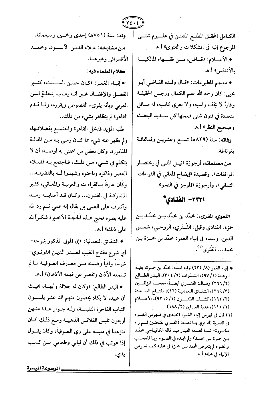 (¬1) قال في فهرس إنباء الغمر: "تصدى في فهرس الضوء في النسبة للفنري بما نصه: (الفنري بفتحتين ثم راء مكسورة- نسبة لصنعة الفينار فيما قاله الكافياجي محمّد بن حمزة بن محمد) ولم نجده في الضوء ويا للعجب والضوء لم يتعرض لمحمد بن حمزة في محله كما تعرض الإنباء في محله" أ. هـ.