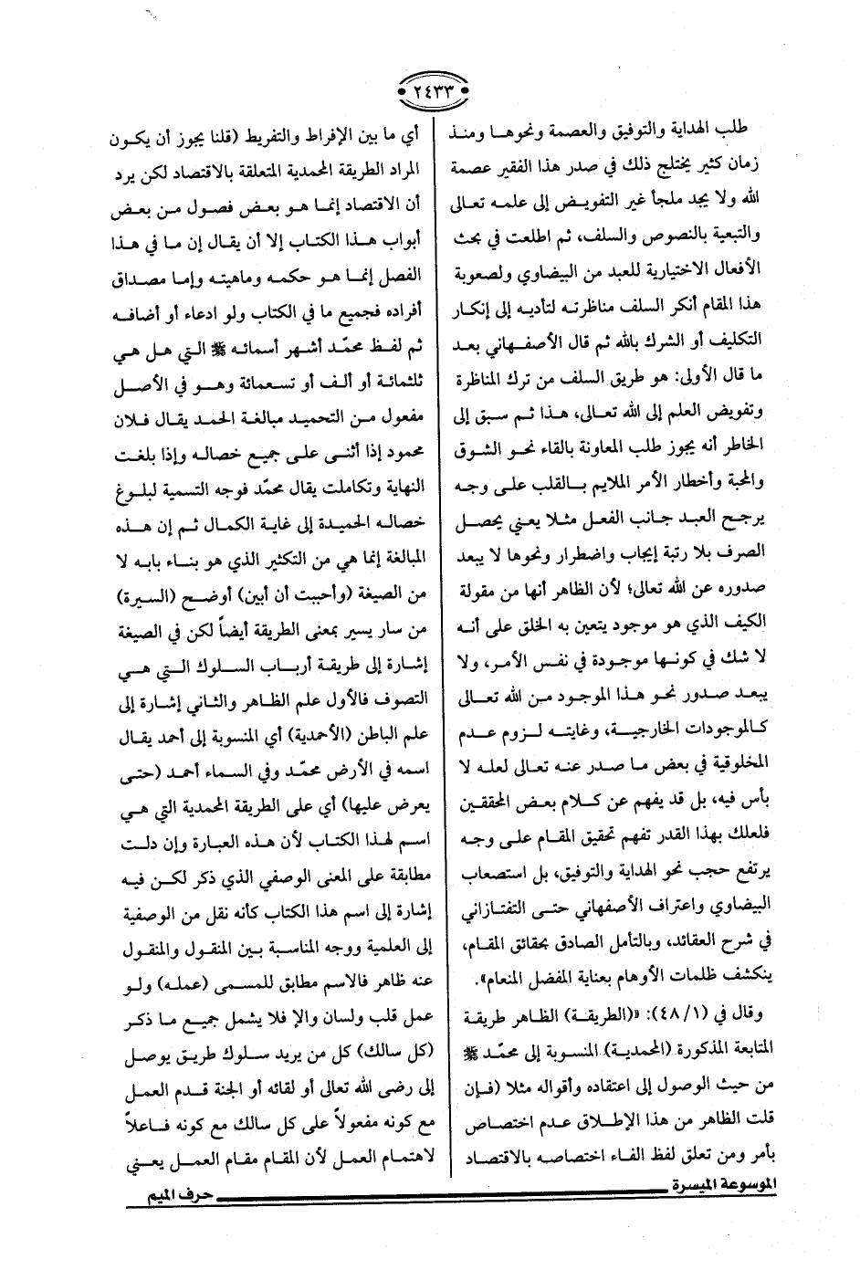 وقال في (1/ 48): " (الطريقة) الظاهر طريقة المتابعة المذكورة (المحمدية) المنسوبة إلى محمّد - صلى الله عليه وسلم - من حيث الوصول إلى اعتقاده وأقواله مثلًا (فإن قلت الظاهر من هذا الإطلاق عدم اختصاص بأمر ومن تعلق لفظ الفاء اختصاصه بالاقتصاد أي ما بين الإفراط والتفريط (قلنا يجوز أن يكون المراد الطريقة المحمدية المتعلقة بالاقتصاد لكن يرد أن الاقتصاد إنما هو بعض فصول من بعض أبواب هذا الكتاب إلا أن يقال إن ما في هذا الفصل إنما هو حكمه وماهيته وإما مصداق أفراده فجميع ما في الكتاب ولو ادعاء أو أضافه ثم لفظ محمّد أشهر أسمائه - صلى الله عليه وسلم - التي هل هي ثلثمائة أو ألف أو تسعمائة وهو في الأصل مفعول من التحميد مبالغة الحمد يقال فلان محمود إذا أثنى على جميع خصاله وإذا بلغت النهاية وتكاملت يقال محمّد فوجه التسمية لبلوغ خصاله الحميدة إلى غاية الكمال ثم إن هذه المبالغة إنما هي من التكثير الذي هو بناء بابه لا من الصيغة (وأحببت أن أبين) أوضح (السيرة) من سار يسير بمعنى الطريقة أيضًا لكن في الصيغة إشارة إلى طريقة أرباب السلوك التي هي التصوف فالأول علم الظاهر والثاني إشارة إلى علم الباطن (الأحمدية) أي المنسوبة إلى أحمد يقال اسمه في الأرض محمّد وفي السماء أحمد (حتى يعرض عليها) أي على الطريقة المحمدية التي هي اسم لهذا الكتاب لأن هذه العبارة وإن دلت مطابقة على المعنى الوصفي الذي ذكر لكن فيه إشارة إلى اسم هذا الكتاب كأنه نقل من الوصفية إلى العلمية ووجه المناسبة بين المنقول والمنقول عنه ظاهر فالاسم مطابق للمسمى (عمله) ولو عمل قلب ولسان وإلا فلا يشمل جميع ما ذكر (كل سالك) كل من يريد سلوك طريق يوصل إلى رضي الله تعالى أو لقائه أو الجنة قدم العمل مع كونه مفعولًا على كل سالك مع كونه فاعلًا لاهتمام العمل لأن المقام مقام العمل يعني