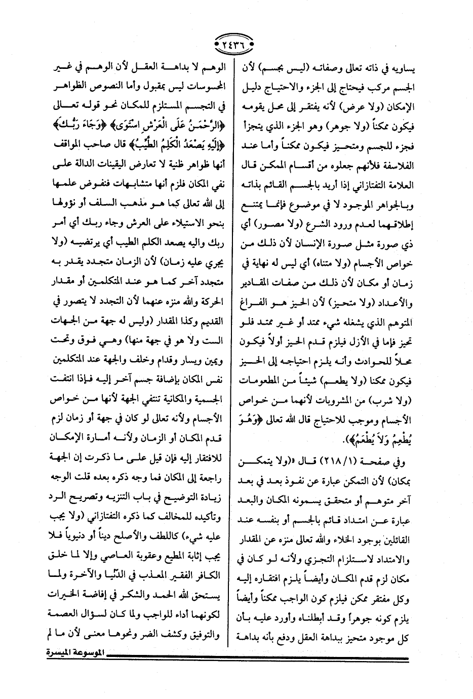وفي صفحة (1/ 218) قال " (ولا يتمكن بمكان) لأن التمكن عبارة عن نفوذ بعد في بعد آخر متوهم أو متحقق يسمونه المكان والبعد عبارة عن امتداد قائم بالجسم أو بنفسه عند القائلين بوجود الخلاء والله تعالى منزه عن المقدار والامتداد لاستلزام التجزي ولأنه لو كان في مكان لزم قدم المكان وأيضًا يلزم افتقاره إليه وكل مفتقر ممكن فيلزم كون الواجب ممكنًا وأيضًا يلزم كونه جوهرًا وقد أبطلناه وأورد عيه بأن كل موجود متحيز ببداهة العقل ودفع بأنه بداهة الوهم لا بداهة العقل لأن الوهم في غير المحسوسات ليس بمقبول وأما النصوص الظواهر في التجسم المستلزم للمكان نحو قوله تعالى {الرَّحْمَنُ عَلَى الْعَرْشِ اسْتَوَى} {وَجَاءَ رَبُّكَ} {إِلَيهِ يَصْعَدُ الْكَلِمُ الطَّيِّبُ} قال صاحب المواقف أنها ظواهر ظنية لا تعارض اليقينات الدالة على نفي المكان فلزم أنها متشابهات فنفوض علمها إلى الله تعالى كما هو مذهب السلف أو نؤولها بنحو الاستيلاء على العرش وجاء ربك أي أمر ربك وإليه يصعد الكلم الطيب أي يرتضيه (ولا يجري عليه زمان) لأن الزمان متجدد يقدر به متجدد آخر كما هو عند المتكلمين أو مقدار الحركة والله منزه عنهما لأن التجدد لا يتصور في القديم وكذا المقدار (وليس له جهة من الجهات الست ولا هو في جهة منها) وهي فوق وتحت ويمين ويسار وقدام وخلف والجهة عند المتكلمين نفس المكان بإضافة جسم آخر إليه فإذا انتفت الجسمية والمكانية تنتفي الجهة لأنها من خواص الأجسام ولأنه تعالى لو كان في جهة أو زمان لزم قدم المكان أو الزمان ولأنه أمارة الإمكان للافتقار إليه فإن قيل على ما ذكرت إن الجهة راجعة إلى المكان فما وجه ذكره بعده قلت الوجه زيادة التوضيح في باب التنزيه وتصريح الرد وتأكيده للمخالف كما ذكره التفتازاني (ولا يجب عليه شيء) كاللطف والأصلح دينًا أو دنيويًا فلا يجب إثابة المطيع وعقوبة العاصي وإلا لما خلق الكافر الفقير المعذب في الدّنْيا والآخرة ولما يستحق الله الحمد والشكر في إفاضة الخيرات لكونهما أداء للواجب ولما كان لسؤال العصمة والتوفيق وكشف الضر ونحوها معنى لأن ما لم