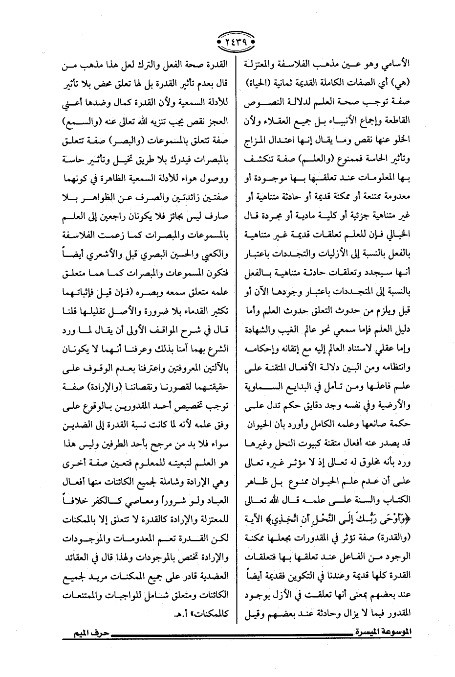 الأسامي وهو عين مذهب الفلاسفة والمعتزلة (هي) أي الصفات الكاملة القديمة ثمانية (الحياة) صفة توجب صحة العلم لدلالة النصوص القاطعة وإجماع الأنبياء بل جميع العقلاء ولأن الخلو عنها نقص وما يقال إنها اعتدال المزاج وتأثير الحاسة فممنوع (والعلم) صفة تنكشف بها المعلومات عند تعلقها بها موجودة أو معدومة ممتنعة أو ممكنة قديمة أو حادثة متناهية أو غير متناهية جزئية أو كلية مادية أو مجردة قال الخيالي فإن للعلم تعلقات قديمة غير متناهية بالفعل بالنسبة إلى الأزليات والتجددات باعتبار أنها سيجدد وتعلقات حادثة متناهية بالفعل بالنسبة إلى المتجددات باعتبار وجودها الآن أو قبل ويلزم من حدوث التعلق حدوث العلم وأما دليل العلم فإما سمعي نحو عالم الغيب والشهادة وإما عقلي لاستناد العالم إليه مع إتقانه واحكامه وانتظامه ومن البين دلالة الأفعال المتقنة على علم فاعلها ومن تأمل في البدايع السماوية والأرضية وفي نفسه وجد دقايق حكم تدل على حكمة صانعها وعلمه الكامل وأورد بأن الحيوان قد يصدر عنه أفعال متقنة كبيوت النحل وغيرها ورد بأنه مخلوق له تعالى إذ لا مؤثر غيره تعالى على أن عدم علم الحيوان ممنوع بل ظاهر الكتاب والسنة على علمه قال الله تعالى {وَأَوْحَى رَبُّكَ إِلَى النَّحْلِ أَنِ اتَّخِذِي} الآية (والقدرة) صفة تؤثر في المقدورات بجعلها ممكنة الوجود من الفاعل عند تعلقها بها فتعلقات القدرة كلها قديمة وعندنا في التكوين فقديمة أيضًا عند بعضهم بمعنى أنها تعلقت في الأزل بوجود المقدور فيما لا يزال وحادثة عند بعضهم وقيل القدرة صحة الفعل والترك لعل هذا مذهب من قال بعدم تأثير القدرة بل لها تعلق محض بلا تأثير للأدلة السمعية ولأن القدرة كمال وضدها أعني العجز نقص يجب تنزيه الله تعالى غنه (والسمع) صفة تتعلق بالمسموعات (والبصر) صفة تتعلق بالمبصرات فيدرك بلا طريق تخيل وتأثير حاسة ووصول هواء للأدلة السمعية الظاهرة في كونهما صفتين زائدتين والصرف عن الظواهر بلا صارف ليس بحائز فلا يكونان راجعين إلى العلم بالمسموعات والمبصرات كما زعمت الفلاسفة والكعبي والحسين البصري قبل والأشعري أيضًا فتكون المسموعات والمبصرات كما هما متعلق علمه متعلق سمعه وبصره (فإن قيل فإثباتهما تكثير القدماء بلا ضرورة والأصل تقليلها قلنا قال في شرح المواقف الأولى أن يقال لما ورد الشرع بهما آمنا بذلك وعرفنا أنهما لا يكونان بالآلتين المعروفتين واعترفنا بعدم الوقوف على حقيقتهما لقصورنا ونقصاننا (والإرادة) صفة توجب تخصيص أحد المقدورين بالوقوع على وفق علمه لأنه لما كانت نسبة القدرة إلى الضدين سواء فلا بد من مرجح بأحد الطرفين وليس هذا هو العلم لتبعيته للمعلوم فتعين صفة أخرى وهي الإرادة وشاملة لجميع الكائنات منها أفعال العباد ولو شرورًا ومعاصي كالكفر خلافًا للمعتزلة والإرادة كالقدرة لا تتعلق إلا بالممكنات لكن القدرة تعم المعدومات والموجودات والإرادة تختص بالموجودات ولهذا قال في العقائد العضدية قادر على جميع الممكنات مريد لجميع الكائنات ومتعلق شامل للواجبات والممتنعات كالممكنات" أ. هـ.