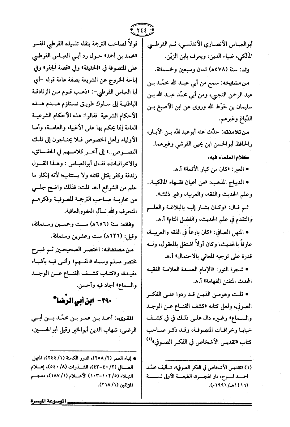 • قلت وهو من الذين قد ردوا على الفكر الصوفي، ولعل كتابه اكشف القناع عن الوجد والسماع" وغيره قال على ذلك في في كشف خبايا وخرافات المتصوفة، وقد ذكر صاحب كتابًا تقديس الأشخاص في الفكر الصوفي" (¬1) قولًا لصاحب الترجمة ينقله تلميذه القرطبي المفسر "محمَّد بن أحمد" حول رد أبي العباس القرطبي على المتصوفة في "الحقيقة" وفي "قصة الجفر" وفي إباحة الخروج عن الشريعة بصفة عامة قوله -أي أبا العباس القرطبي-: "ذهب قوم من الزنادقة الباطنية إلى سلوك طريق تستلزم هدم هذه الأحكام الشرعية فقالوا: هذه الأحكام الشرعية العامة إنما يحكم بها على الأغبياء والعامة، وأما الأولياء وأهل الخصوص فلا يحتاجون إلى تلك النصوص .. " إلى آخر كلامهم في الحقائق، والانحرافات، فقال أبو العباس: وهذا القول زندقة وكفر يقتل قائله ولا يستتاب؛ لأنه إنكار ما علم من الشرائع أ. هـ. قلت: فذلك واضح جلي من محاربة صاحب الترجمة للصوفية وفكرهم المنحرف والله نسأل العفو والعافية.