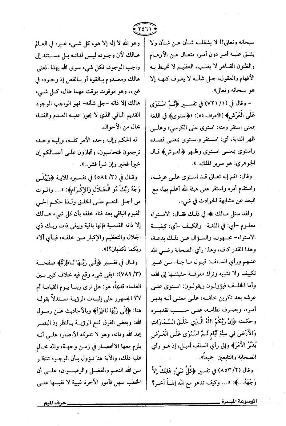 وقال (2/ 853) في تفسير {كُلُّ شَيءٍ هَالِكٌ إلا وَجْهَهُ ... }: " ... وكيف تدعو مع الله إلهًا آخر؟ وهو الله لا إله إلا هو، كل شيء غيره في العالم هالك لأن وجوده ليس لذاته بل مستند إلى واجب الوجود، فكل شيء سوى الله بهذا المعنى هالك ومعدوم بالقوة أو بالفعل إذ وجوده في غيره، وهو موقوت بوقت مهما طال، كل شيء هالك إلا ذاته - جل شأنه - فهو الواجب الوجود القديم الباقي الذي لا يجوز عليه العدم والفناء بحال من الأحوال.