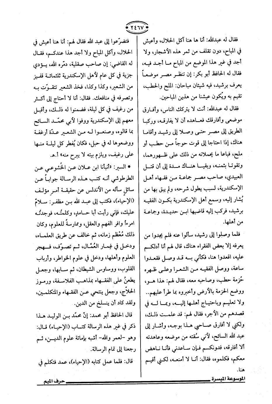 * السير: "أنبأنا ابن علان عن الخُشوعي عن الطرطوشي أنه كتب هذه الرسالة جوابًا عن سائلٍ سأله من الأندلس عن حقيقة أمرِ مؤلف (الإحياء)، فكتب إلى عبد الله بن مظفر: سلَّامٌ عليك، فإني رأيت أبا حامدٍ، وكلمتُه، فوجدتُه امرءًا وافر الفهم والعقل، وممارسةً للعلوم، وكان ذلك مُعْظم زمانه، ثم خالف عن طريق العلماء، ودخل في غِمار العُمَّال، ثم تصوَّف، فهجر العلوم وأهلها، ودخل في علوم الخواطر، وأرباب القلوب، ووساوس الشيطان، ثم سابها، وجعل يطعنُ على الفقهاء بمذاهب الفلاسفة، ورموز الحلَّاج، وجعل ينتحي عن الفقهاء والمتكلمين، ولقد كاد أن ينسلخ من الدين.