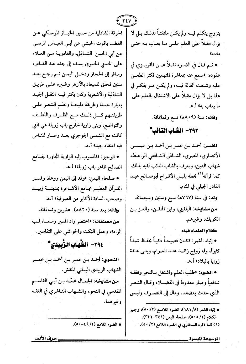 المفسر: أحمد بن عمر بن أحمد بن عيسى الأنصاري، المصري، الشاذلي الشافعي الواعظ، شهاب الدين، ويعرف بالشاب التائب لقبه بذلك كما قرأته (¬1) بخطه بلبل الأفراح أبو صالح عبد القادر الجيلي في المنام.