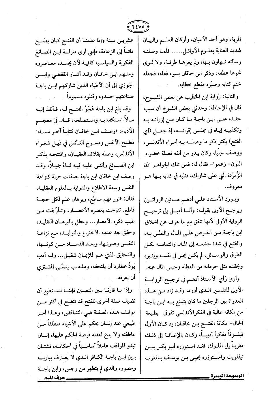 وإذا ما قارنا بين النصين فإننا نستطيع أن نضيف صفة أخرى للفتح قد تتضح في أكثر من موقف هذه الصفة هي التناقض، وهذا أمر طبيعي عند إنسان يحكم على الأشياء منطلقًا من عاطفته ولا يدع لعقله فرصة الحكم عليها، إنسان تبدو المواقف عاملًا أساسيًا في أحكامه، فشتان بين ابن باجة الكافر الذي لا يعترف بباريه ومصوره والذي لم يتطهر من رجس، وابن باجة
