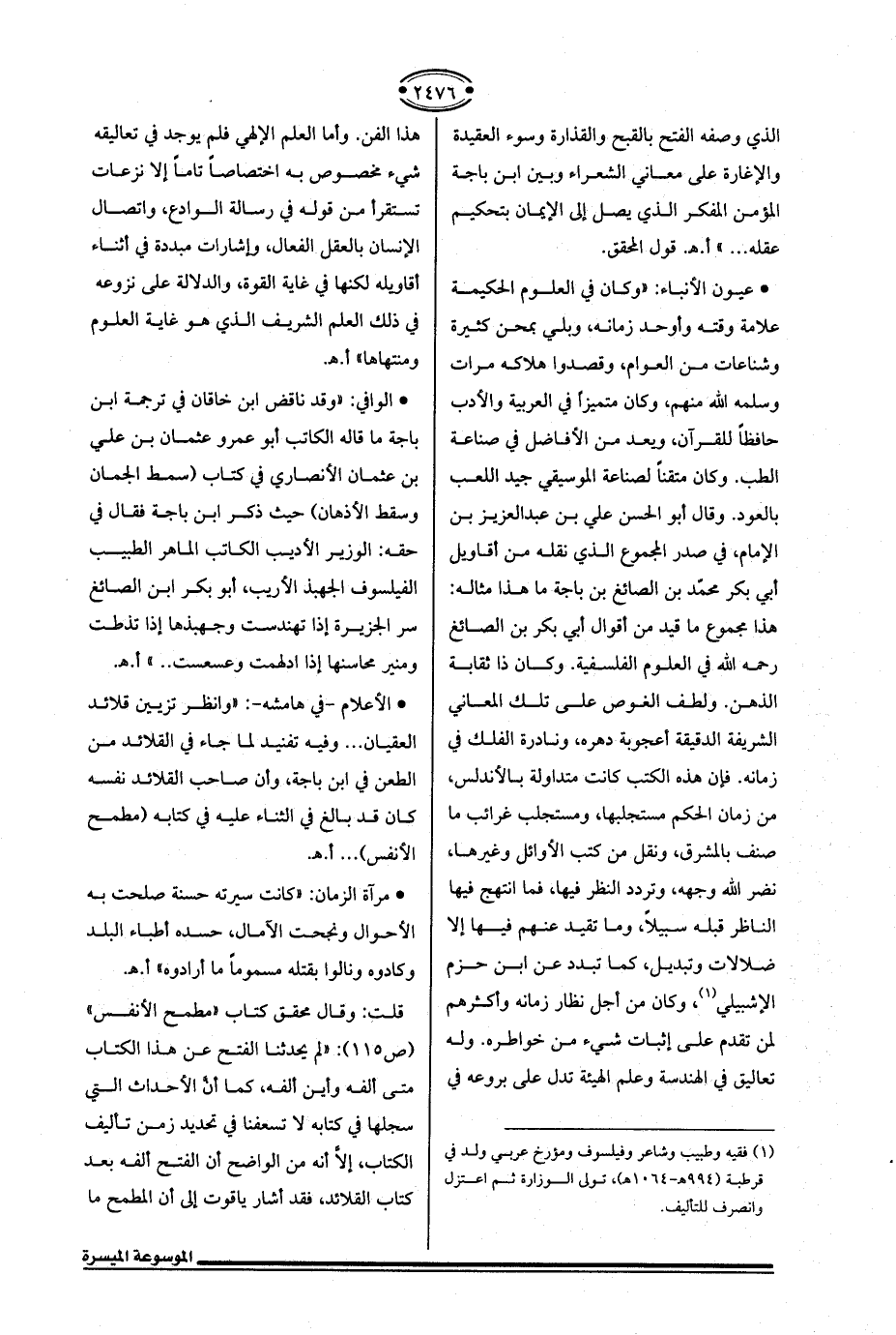 * الأعلام - في هامشه -: "وانظر تزيين قلائد العقيان ... وفيه تفنيد لما جاء في القلائد من الطعن في ابن باجة، وأن صاحب القلائد نفسه كان قد بالغ في الثناء عليه في كتابه (مطمح الأنفس) ... أ. هـ.