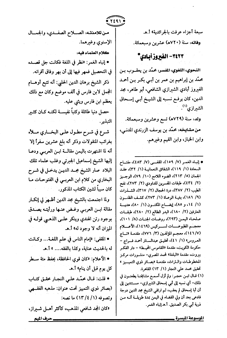 النحوي، اللغوي، المفسر: محمّد بن يعقوب بن محمّد بن إبراهيم بن عمر بن أبي بكر بن أحمد الفيروز أبادي الشيرازي الشافعي، أبو طاهر، مجد الدين، كان يرفع نسبه إلى الشيخ أبي إسحاق الشيرازي (¬1).