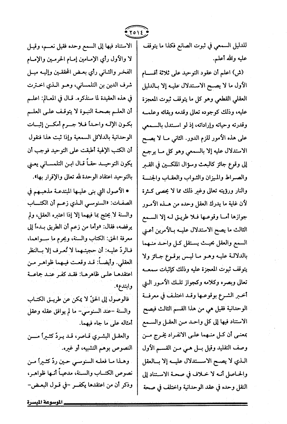 * الأصول التي بنى عليها المبتدعة مذهبهم في الصفات: "السنوسي الذي زعم أن الكتاب والسنة لا يحتج بما فيهما إلا إذا اعتبره العقل، ولم يرفضه، فقال: "وأما من زعم أن الطريق بدءًا إلى معرفة الحق: الكتاب والسنة، ويحرم ما سواهما، فالردّ عليه: أن حجيتهما لا تُعرف إلا بالنظر العقلي. وأيضًا: قد وقعت فيهما ظواهر من اعتقدها على ظاهرها: فقد كفر عند جماعة وابتدع".