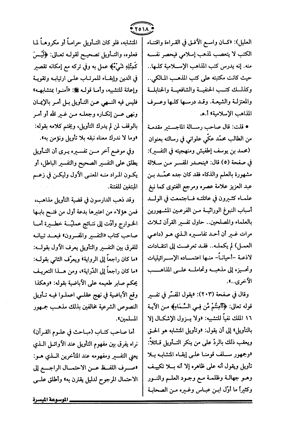 وقال في صفحة (203): "يقول المفسّر في تفسير قوله تعالى: {أَأَمِنْتُمْ مَنْ فِي السَّمَاءِ} من الآية 16 الملك نفيًا للتشبيه: "ولا يزول الإشكال إلا بالتأويل" إلى أن يقول: "وتأويل المتشابه هو الحق ويعقب ذلك بالردّ على من ينكر التأويل قائلًا: "وجمهور سلف قومنا على إبقاء المتشابه بلا تأويل ويقول أنه على ظاهره إلا أنه بلا تكييف وهو جهالة وظلمة مع وجود العلم والنور وكثيرًا ما أوّل ابن عباس وغيره من الصحابة المتشابه، فلو كان التأويل حرامًا أو مكروهًا لما فعلوه، والتأويل تصحيح لقوله تعالى: {لَيسَ كَمِثْلِهِ شَيءٌ} عمل به وفي تركه مع إمكانه تقصير في الدين وإبقاء للمرتاب على ارتيابه وتقوية وإعانة للتشبيه، وأما قوله - صلى الله عليه وسلم -: "آمنوا بمتشابهه" فليس فيه النهي عن التأويل بل أمر بالإيمان ونهى عن إنكاره وجعله من غير الله أو أمر بالوقف لمن لم يدرك التأويل، ويختم كلامه بقوله: "وما لا ندرك معناه نبقه بلا تأويل ونؤمن به".