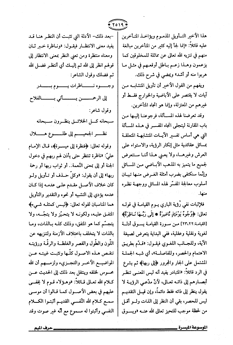 وقوله تعالى: {فَنَظِرَةٌ إِلَى مَيسَرَةٍ}، قال الإمام عليّ: "ناظرة تنتظر حتى يأذن لهم ربهم في دخول الجنة أو إلى بمعنى النّعمة .. أو ثواب ربها أو رحمة ربها" إلى أن يقول: "وكلّ حذف أو تأويل ولو كان خلاف الأصل مقدم على عدمه إذا كان عدمه يؤدي إلى التشبيه أو نحوه والتقدير والتأويل هما المناسبان لقوله تعالى: {لَيسَ كَمِثْلِهِ شَيءٌ} المتفق عليه، ولكونه لا يتحيّز ولا يتجّه، ولا يتجسّم كما هو المتفق، وذلك كله بالذات، وما بالذات لا يتخلف باختلاف الأزمنة ولتنزيهه عن اللّون والطّول والقصر والغلظة والرقّة ورؤيته تنقص هذه الاصول كلّها وتثبت غيبته عن المواضيع الأخر والتجزيء ولزمهم أن الله محسوس لخلقه وينتقل بعد ذلك إلى الحديث عن كلام الله تعالى قائلًا: "وهؤلاء قوم لا يخفى عليهم في بعض الأصول كما قالوا أن موسى سمع كلام الله النّفسي القديم أثبتوا الكلام النفسي وأثبتوا له مسموع مع أنه غير صوت وقد