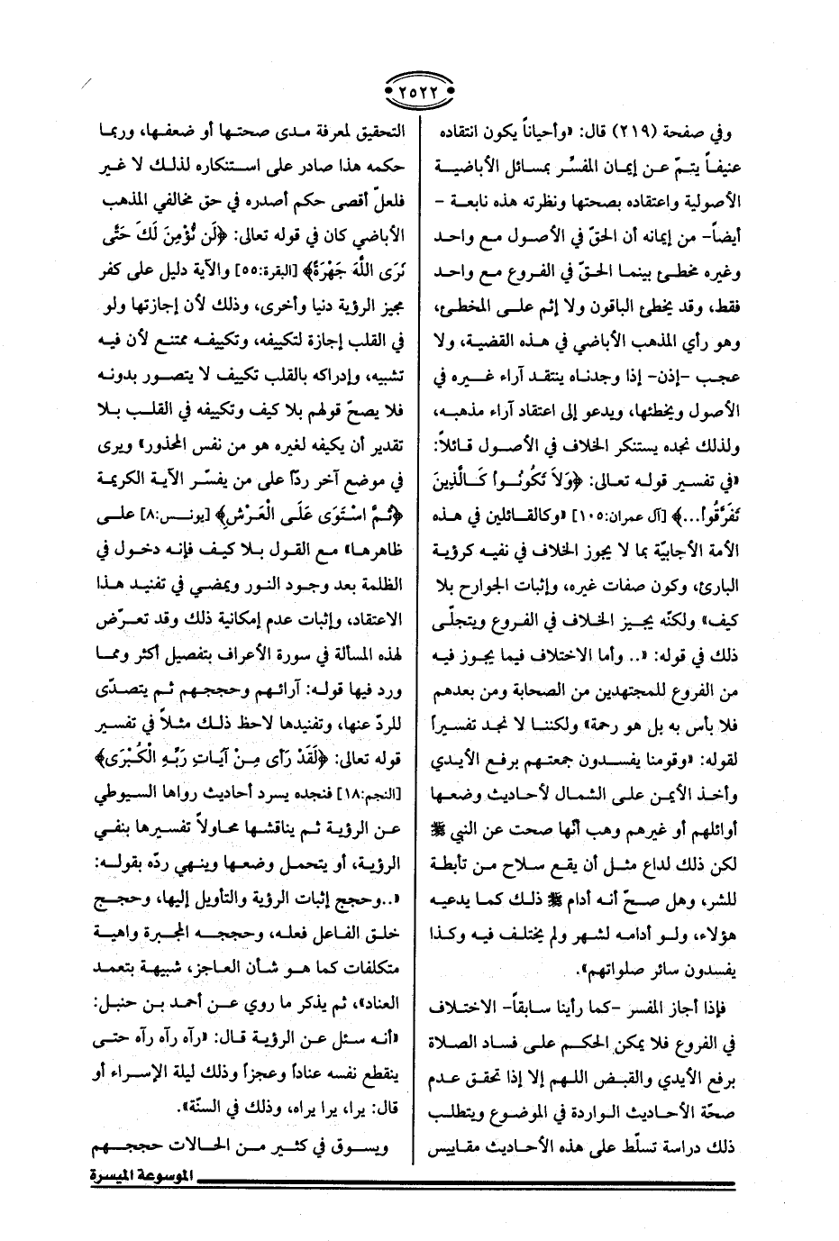 وفي صفحة (219) قال: "وأحيانًا يكون انتقاده عنيفًا يتمّ عن إيمان المفسِّر بمسائل الأباضية الأصولية واعتقاده بصحتها ونظرته هذه نابعة -أيضًا- من إيمانه أن الحقّ في الأصول مع واحد وغيره مخطئ بينما الحقّ في الفروع مع واحد فقط، وقد يخطئ الباقون ولا إثم على المخطئ، وهو رأي المذهب الأباضي في هذه القضية، ولا عجب -إذن- إذا وجدناه ينتقد آراء غيره في الأصول ويخطئها، ويدعو إلى اعتقاد آراء مذهبه، ولذلك نجده يستنكر الخلاف في الأصول قائلًا: "في تفسير قوله تعالى: {وَلَا تَكُونُوا كَالَّذِينَ تَفَرَّقُوا} [آل عمران: 105] "وكالقائلين في هذه الأمة الأجابيّة بما لا يجوز الخلاف في نفيه كرؤية البارئ، وكون صفات غيره، وإثبات الجوارح بلا كيف" ولكنّه يجيز الخلاف في الفروع ويتجلّى ذلك في قوله: " .. وأما الاختلاف فيما يجوز فيه من الفروع للمجتهدين من الصحابة ومن بعدهم فلا بأس به بل هو رحمة" ولكننا لا نجد تفسيرًا لقوله: "وقومنا يفسدون جمعتهم برفع الأيدي وأخذ الأيمن على الشمال لأحاديث وضعها أوائلهم أو غيرهم وهب أنّها صحت عن النبي - صلى الله عليه وسلم - لكن ذلك لداع مثل أن يقع صلاح من تأبطة للشر، وهل صحّ أنه أدام - صلى الله عليه وسلم - ذلك كما يدعيه هؤلاء، ولو أدامه لشهر ولم يختلف فيه وكذا يفسدون سائر صلواتهم".